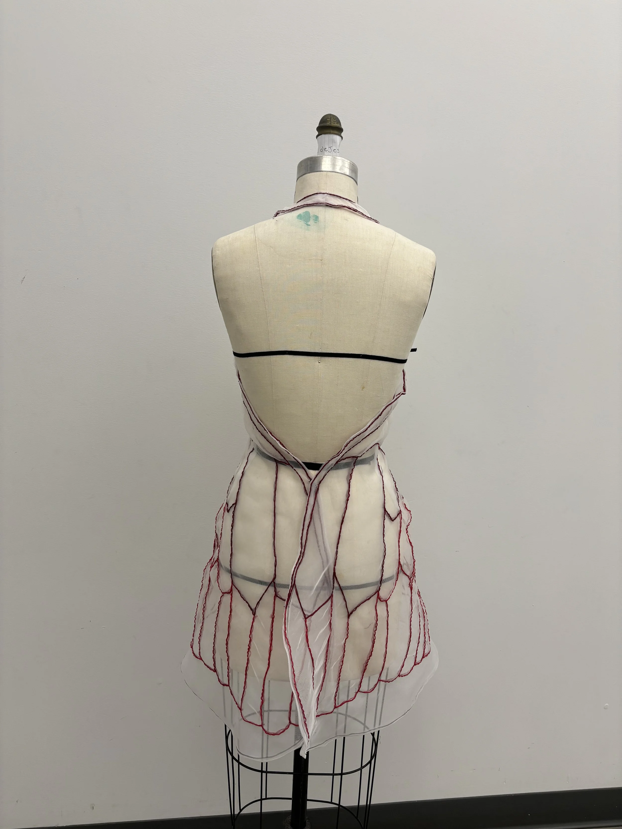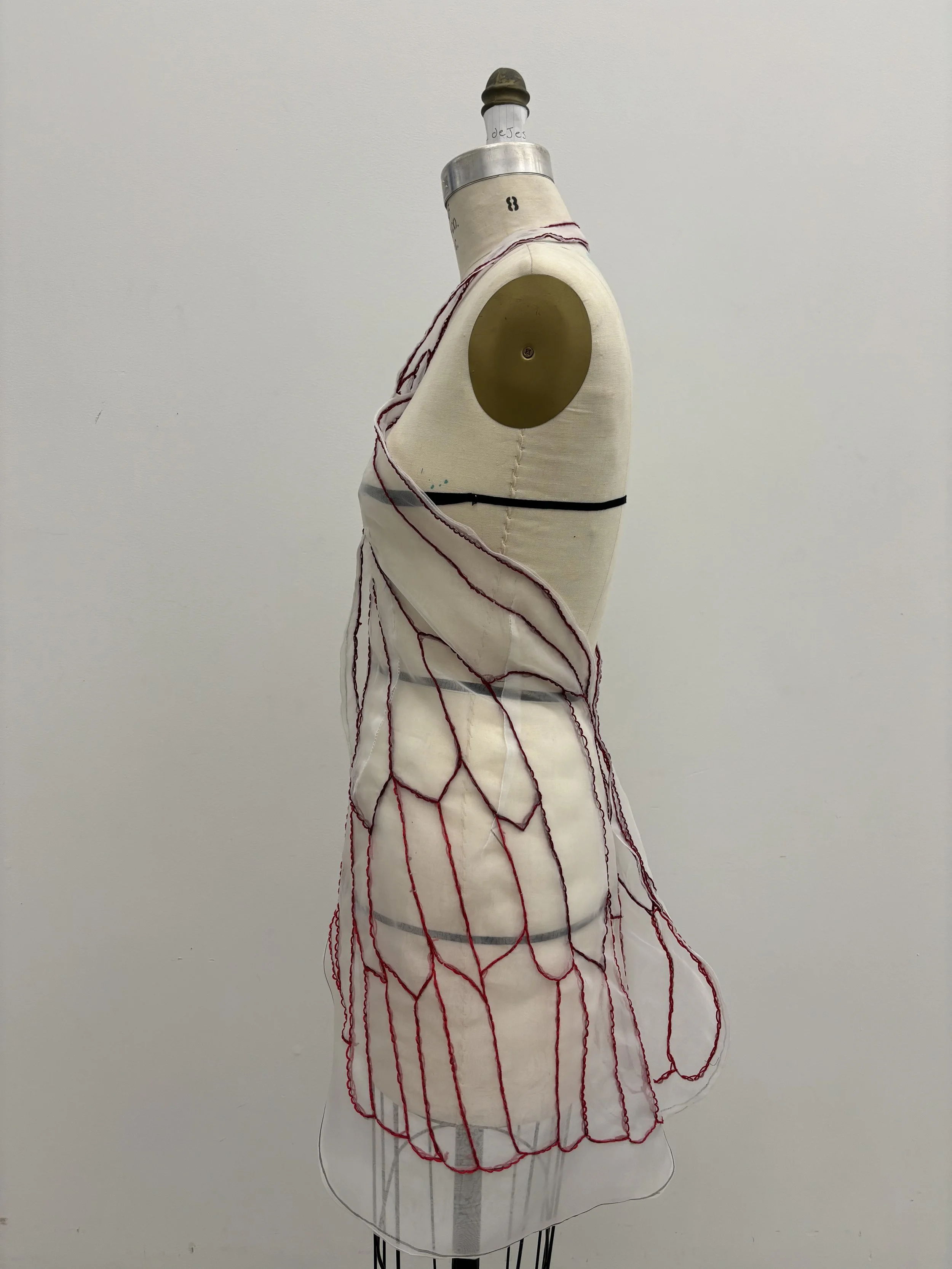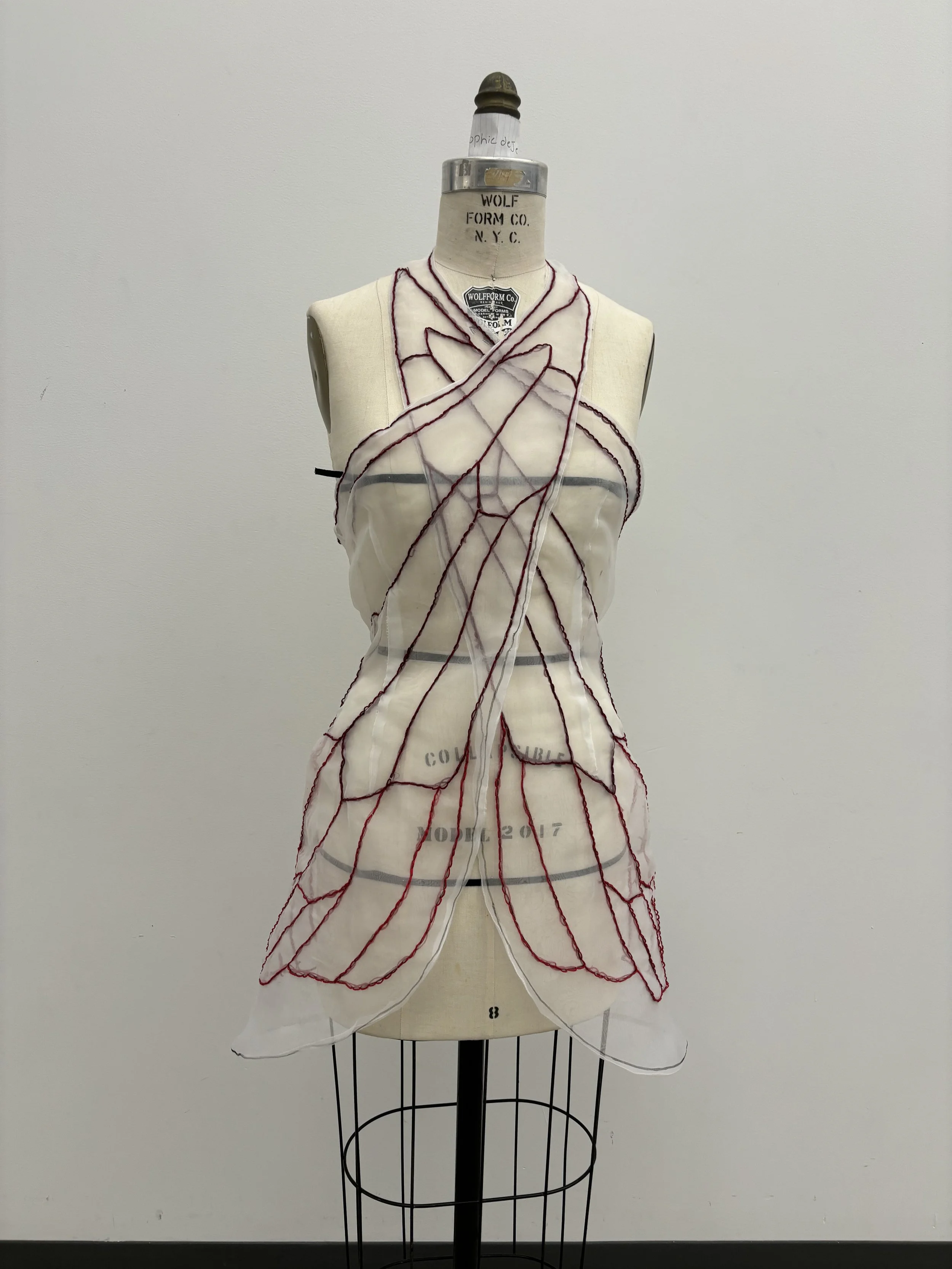 2024; size 8; Double layered polyester organza, hand embroidered to create wing pattern.