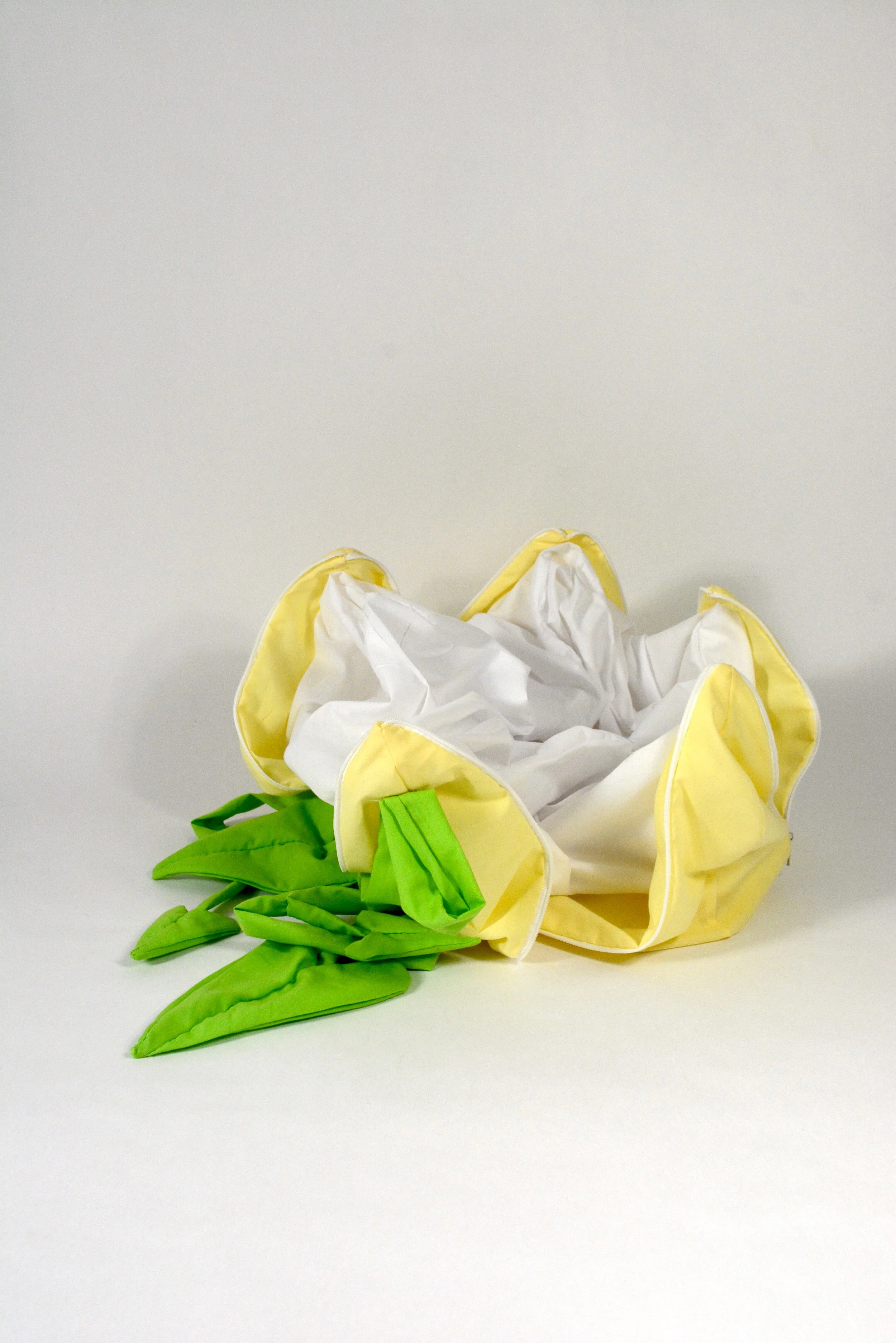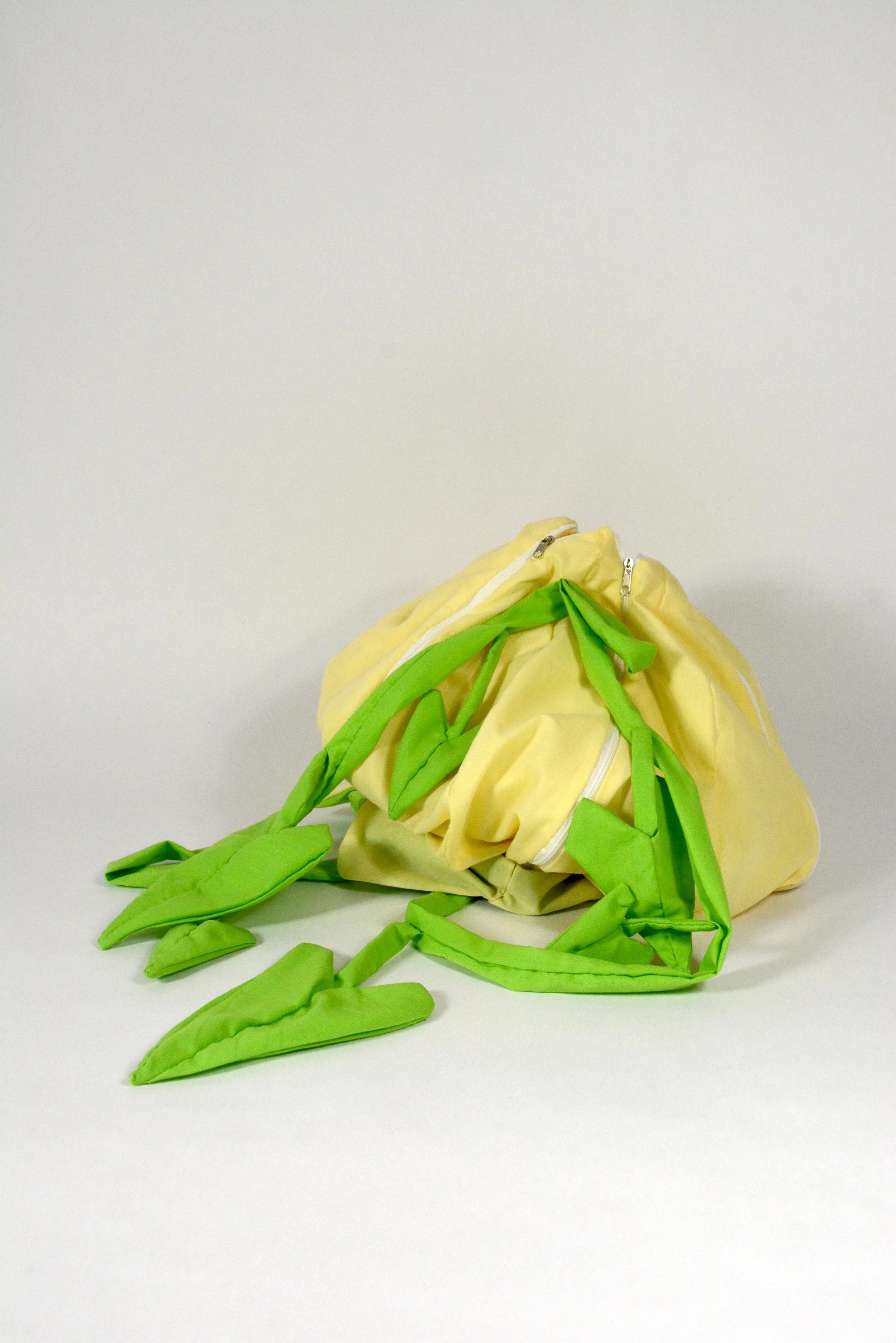 The bag is hand stitched lightweight cotton, made to mimic an unfurling morning glory bud. The bag consists of five double sided panels that can zipped together, and two backpack straps with heart shaped leaves dangling off of it.