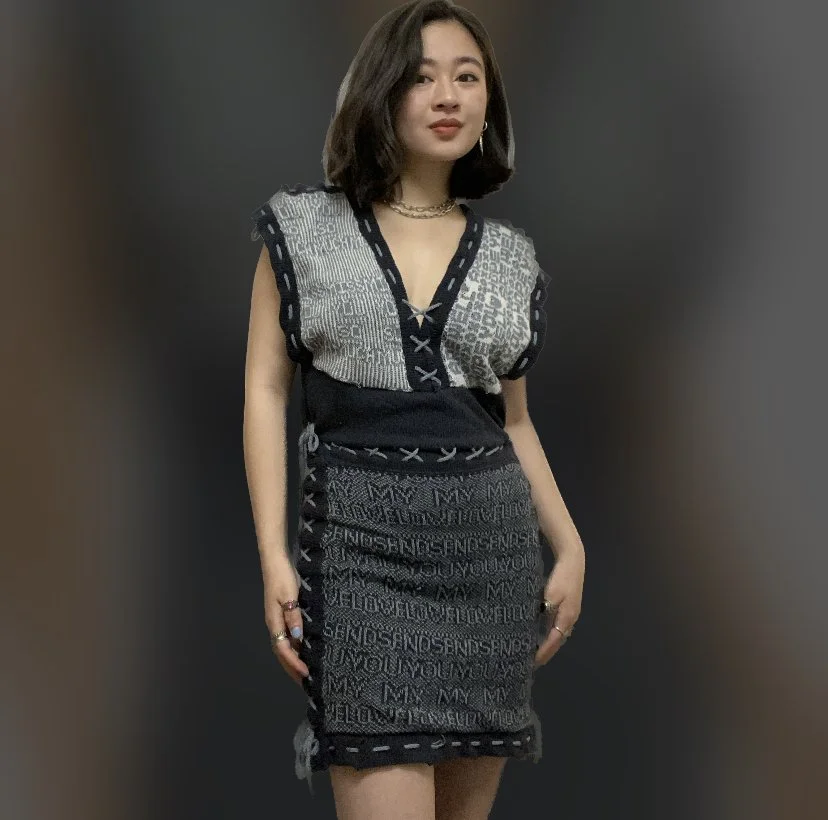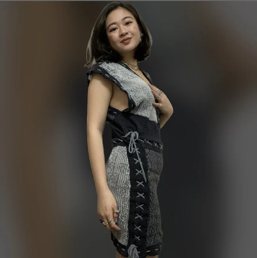 The dress is modular and stitched together using i-chords, and each panel is double sided with the patterned knitting on the outside and plain knitting inside.