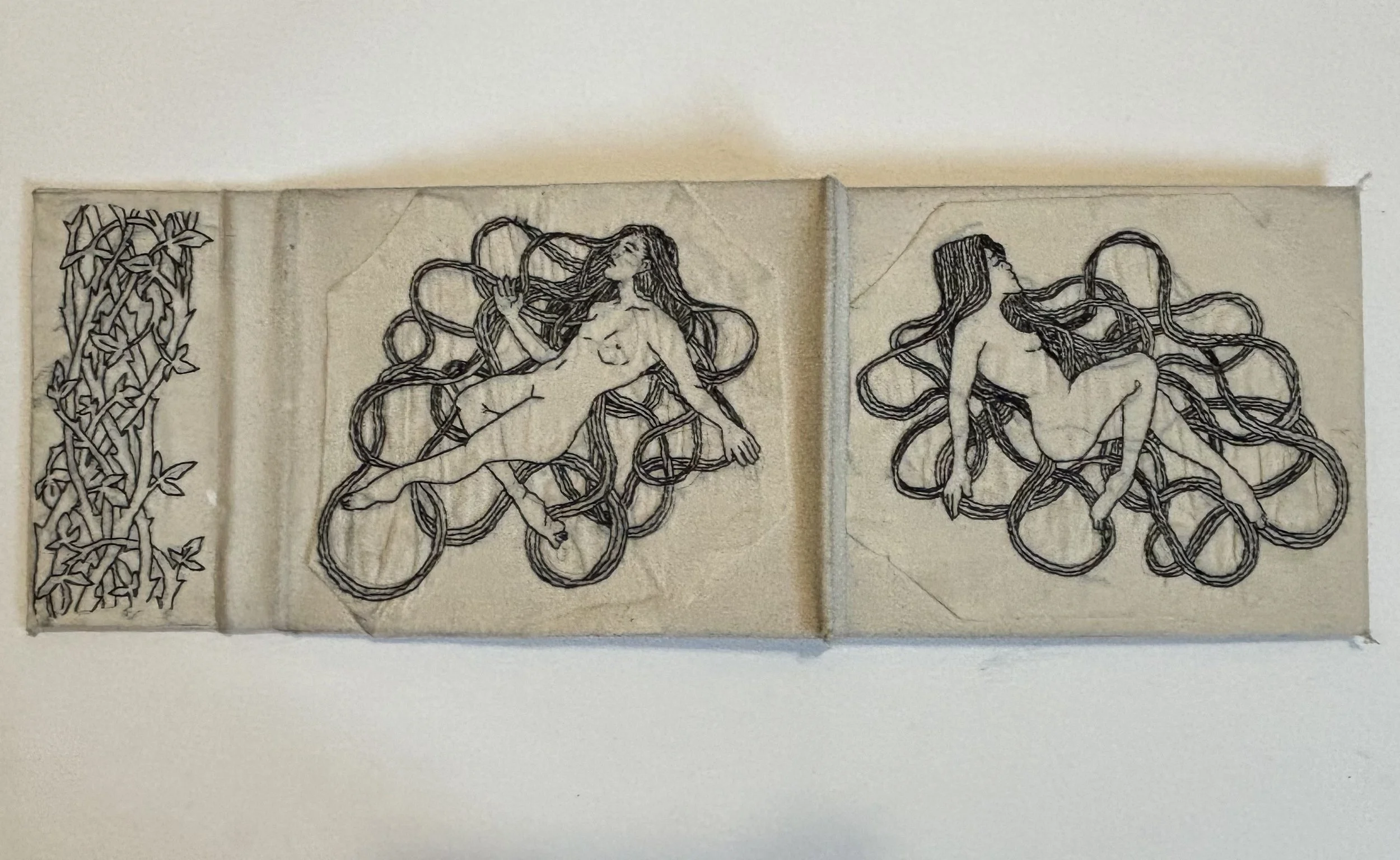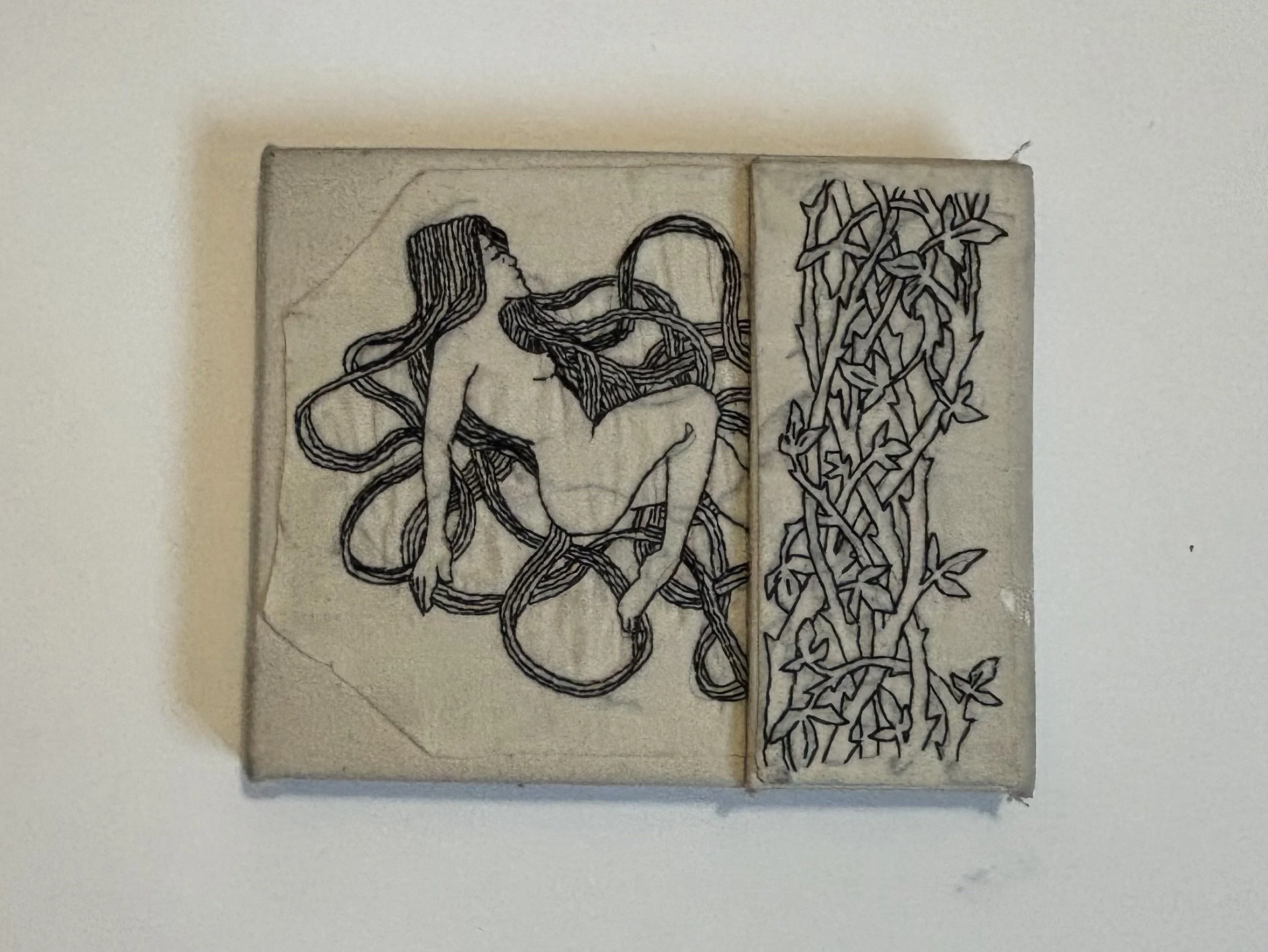Hair Lady Box; 2022; 9” x 6” x 3” handmade box with embroidered designs; canvas, corduroy, matte board