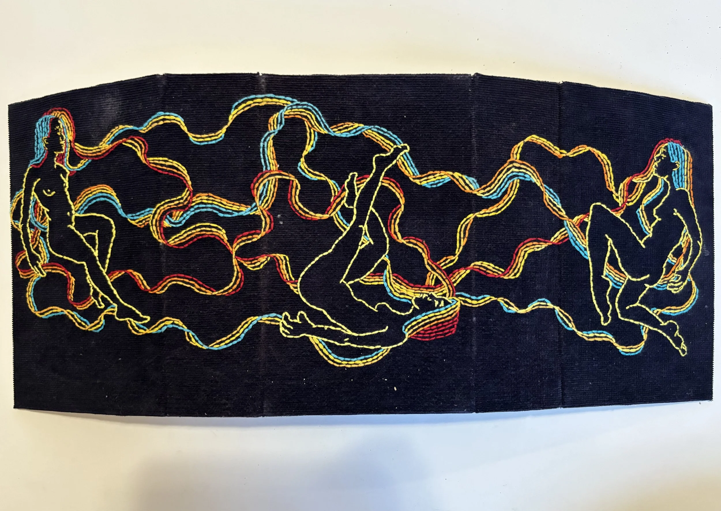 hand bound sketchbook with embroidered cover and magnet closure; 9”x 7”; contents include drawings, paintings and linoleum prints