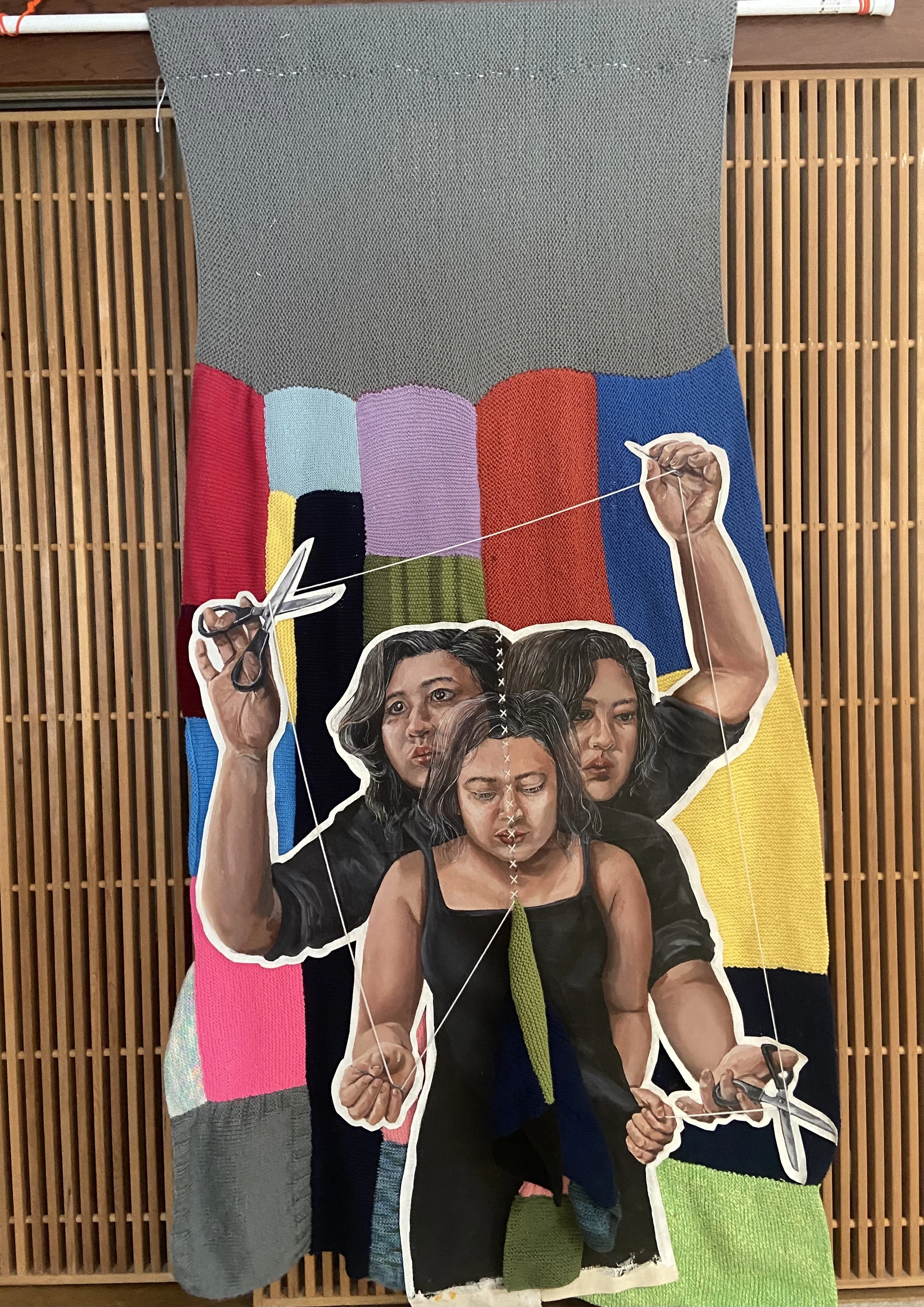 Patchwork Person; hand knit swatches, acrylic on canvas