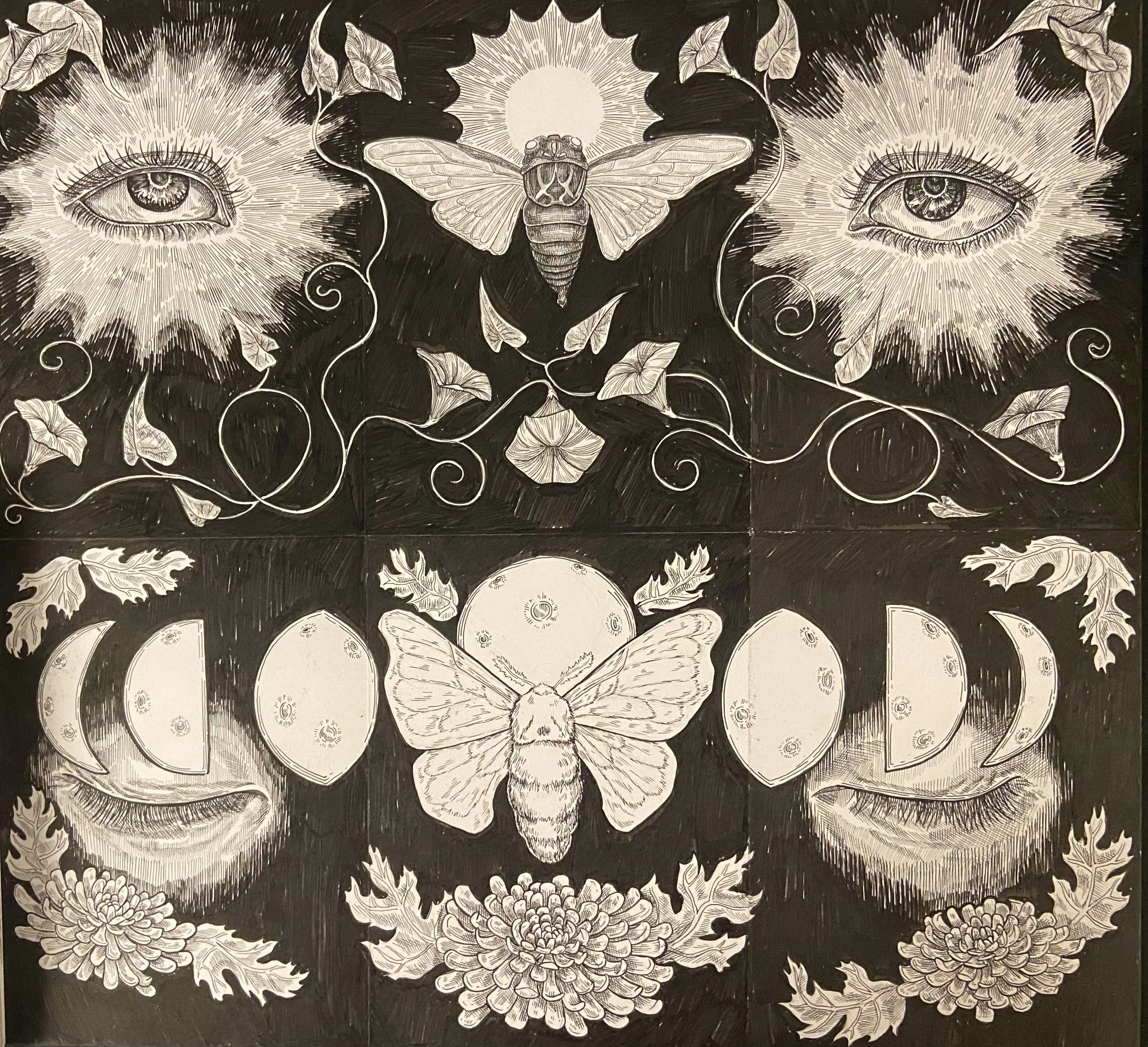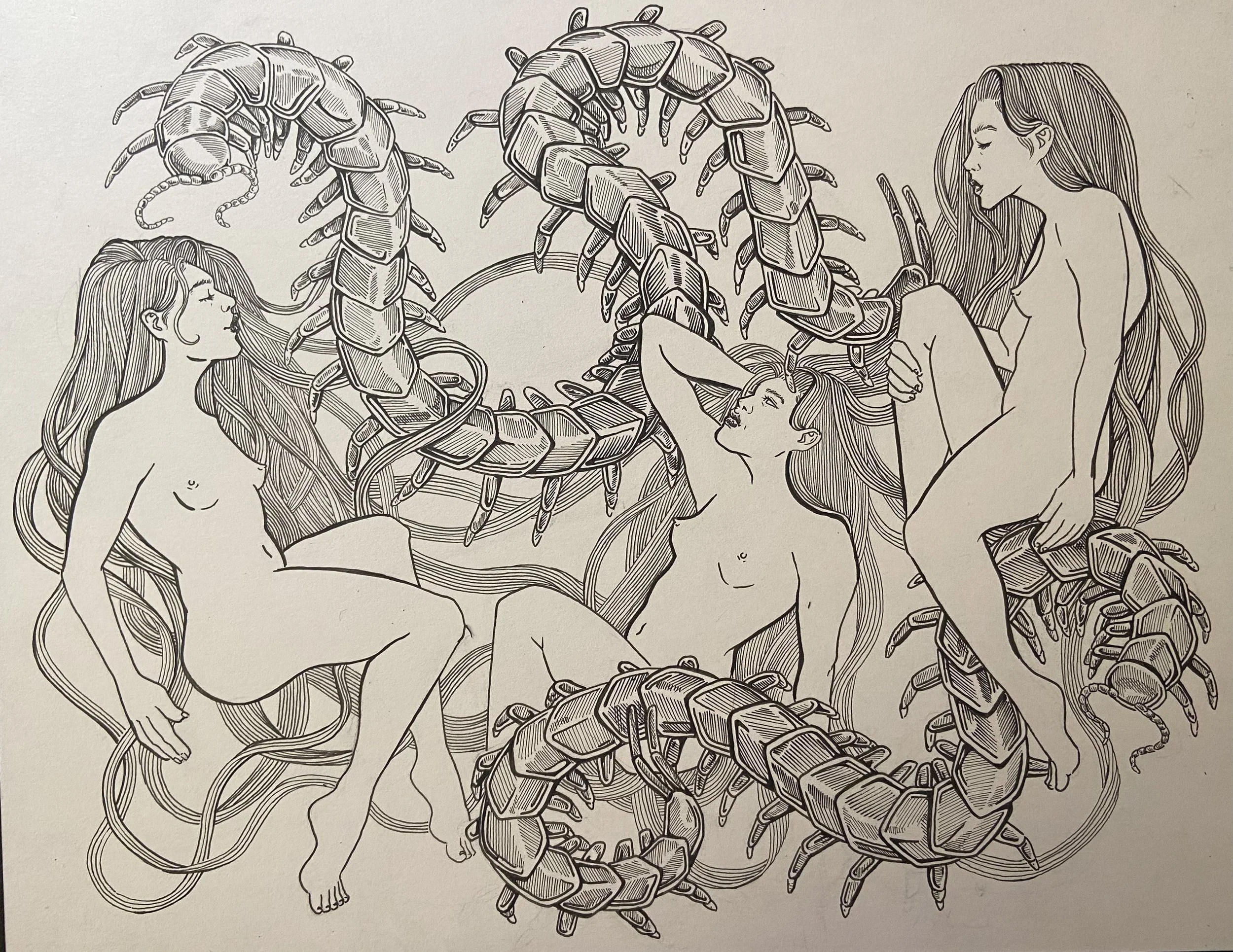 Hair Ladies with Centipedes; 12” x 10”; pen and ink on paper