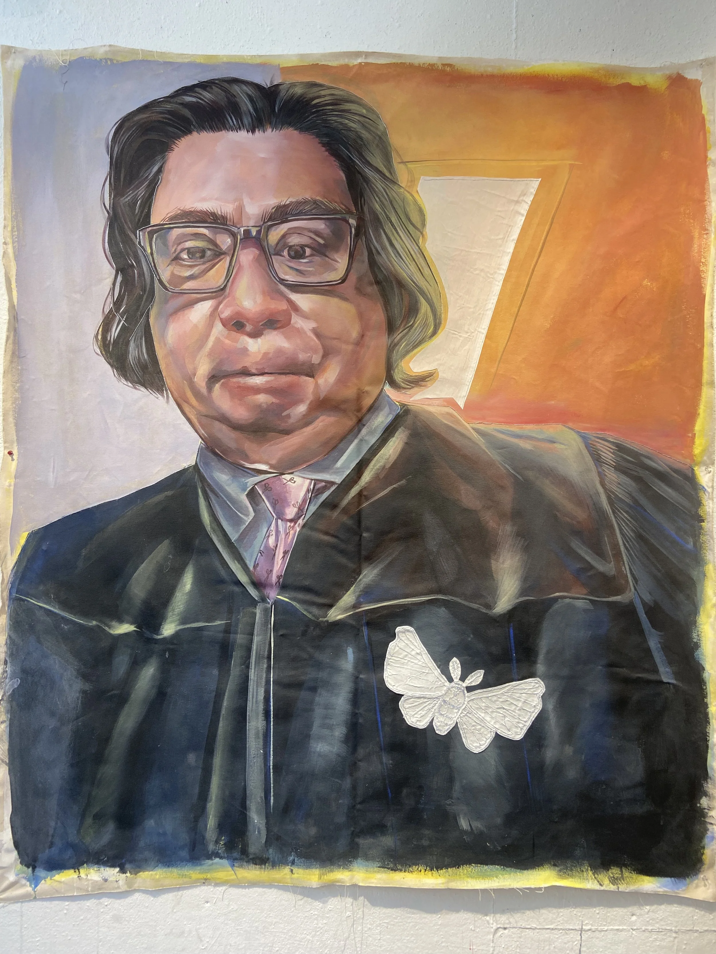 Judge Dad; 6ft x 5.5ft; acrylic on canvas, cotton embroidered with nylon