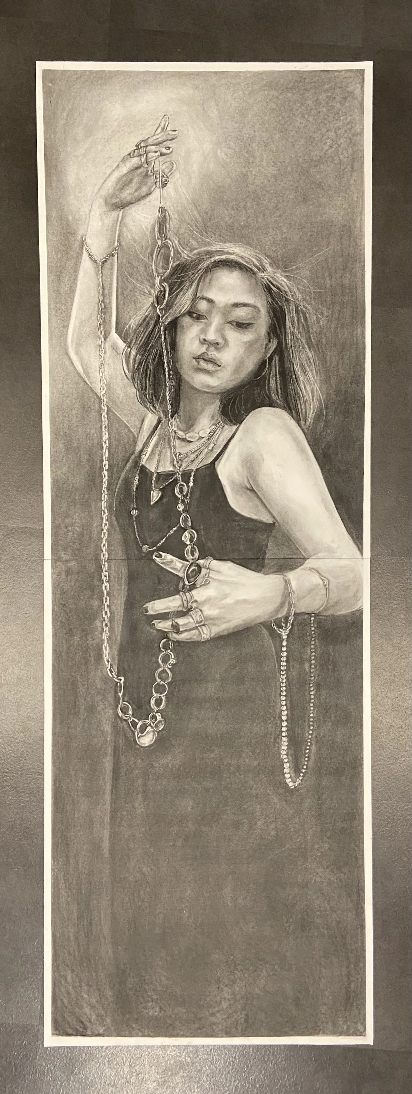 Jewelry Self Portrait; 6ft x 1.5ft; charcoal on paper