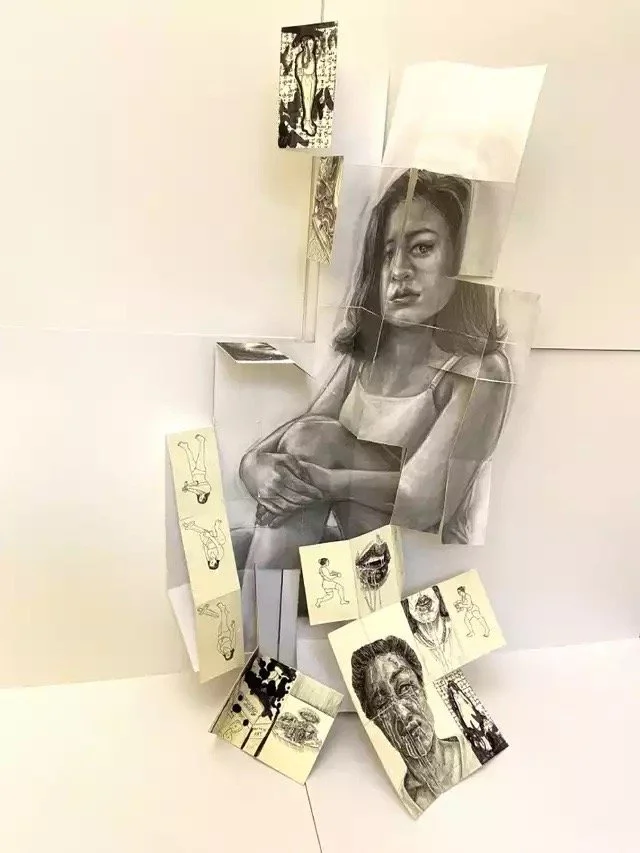 Wretched; 24” x 20”; graphite on paper, pen and ink on note cards
