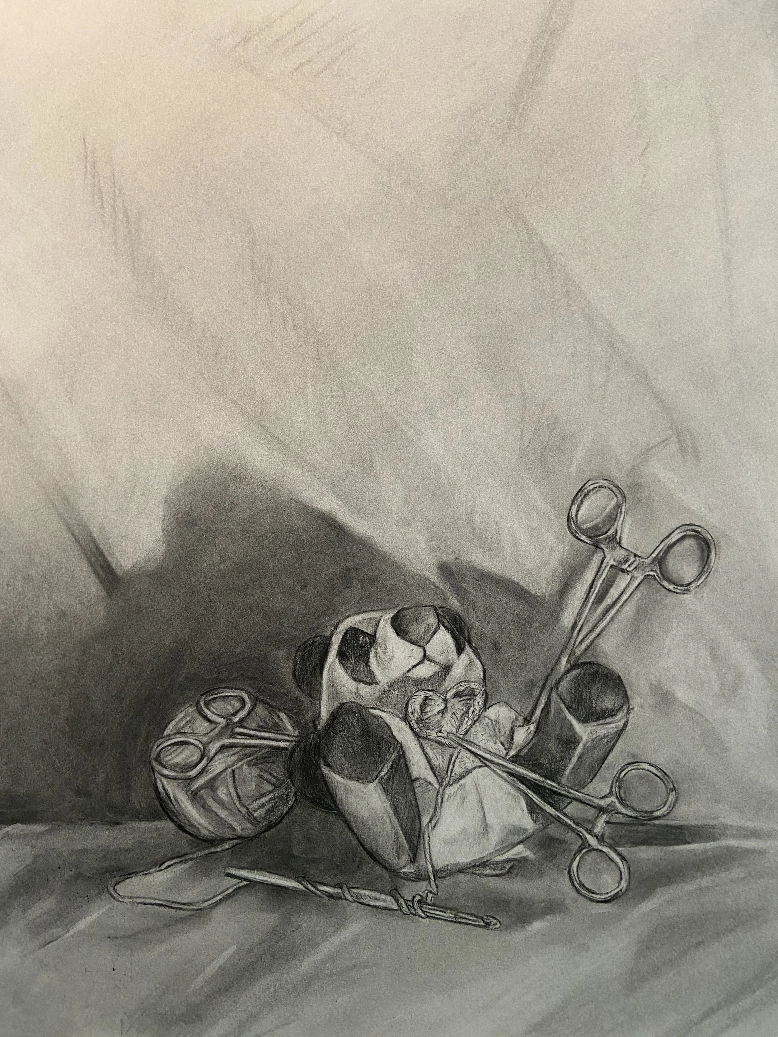Teddy Surgery; 17” x 14”; charcoal on paper