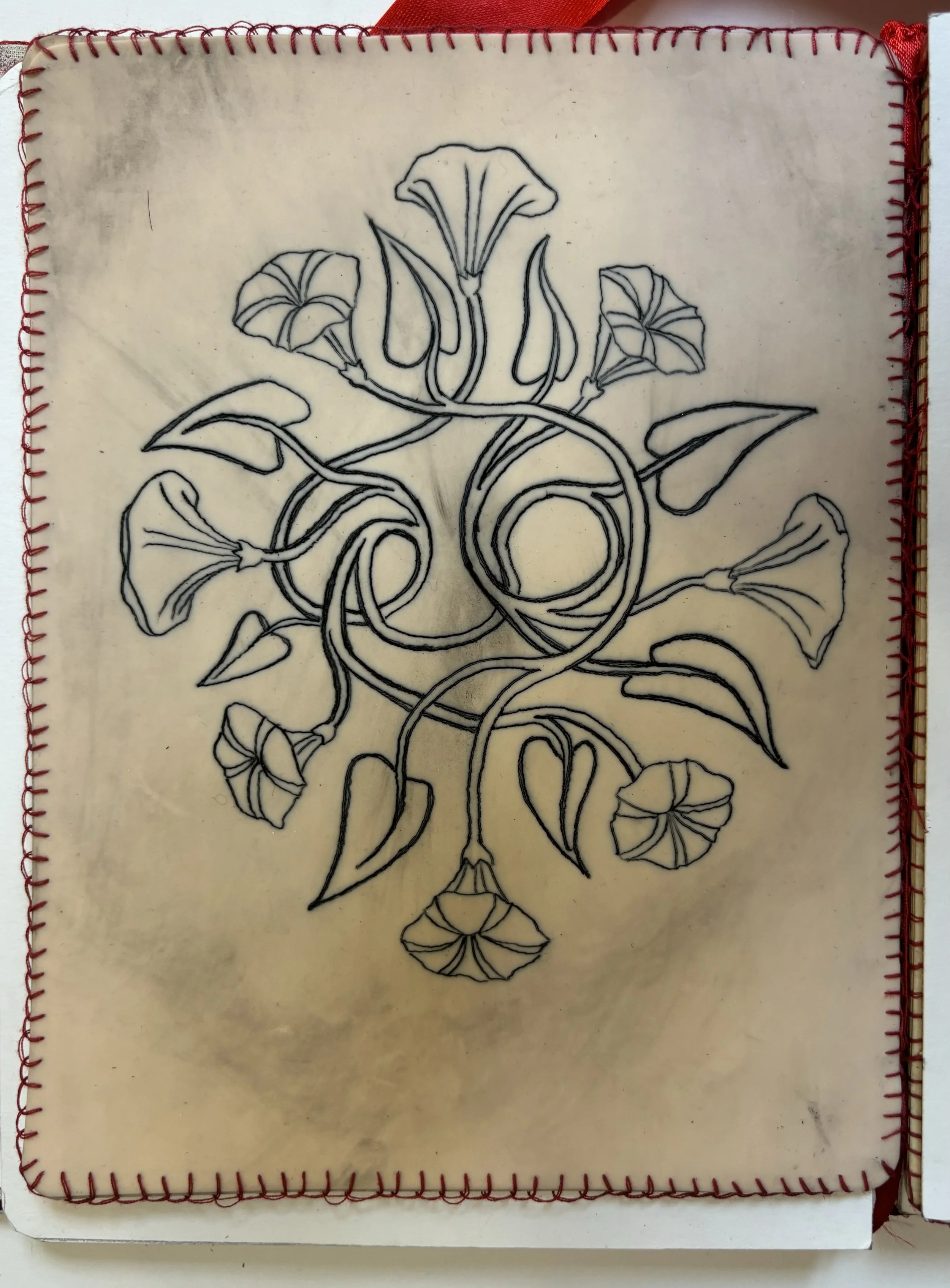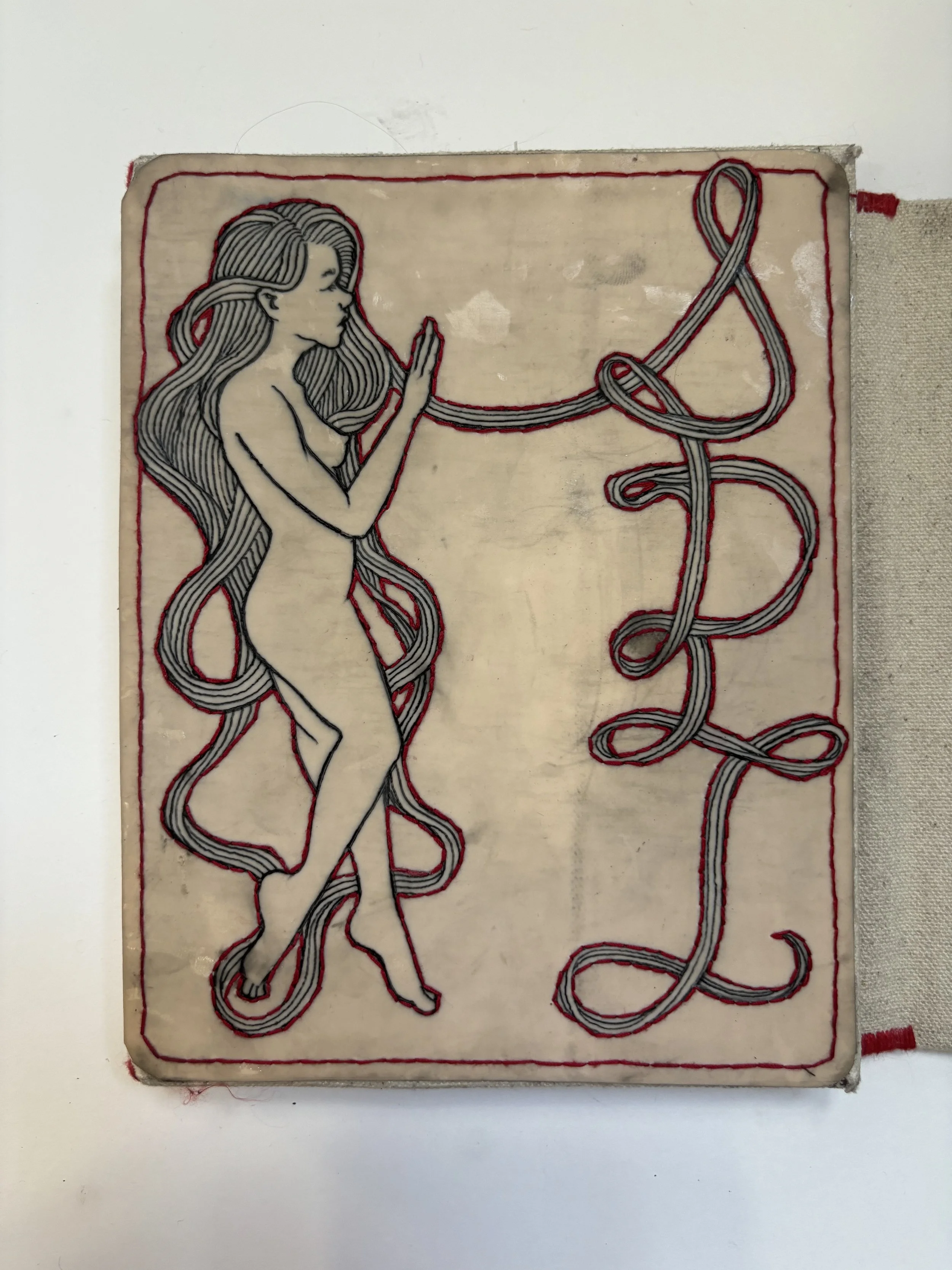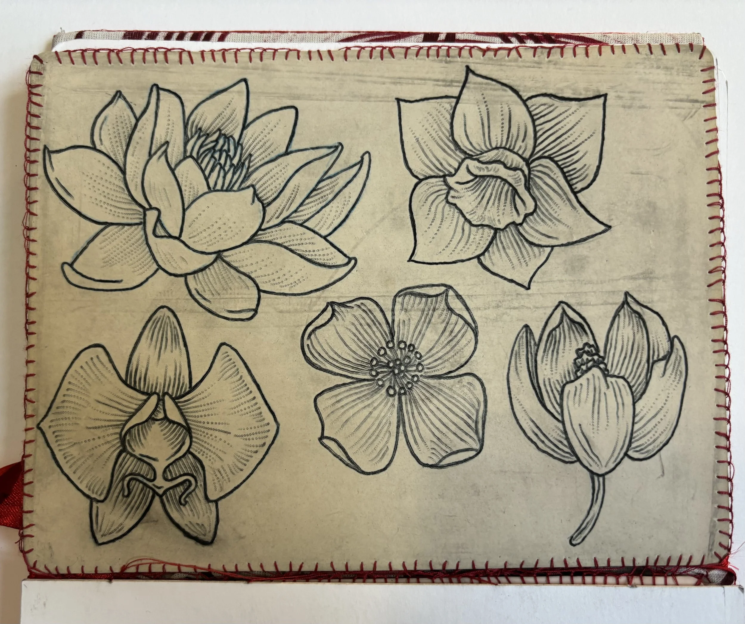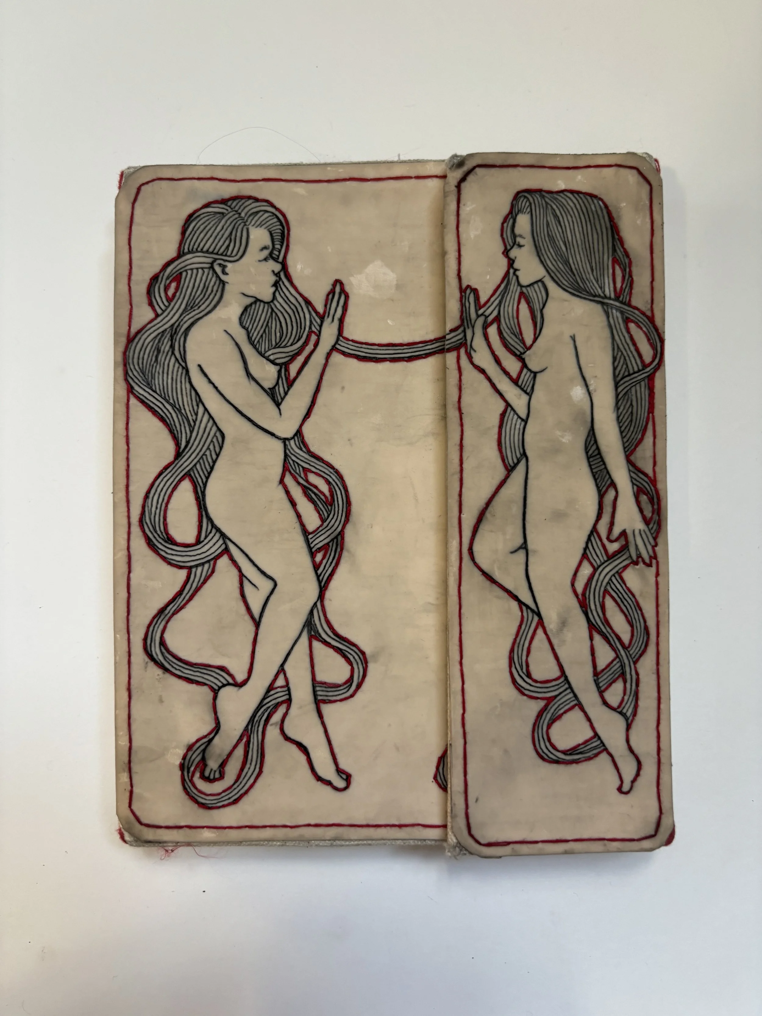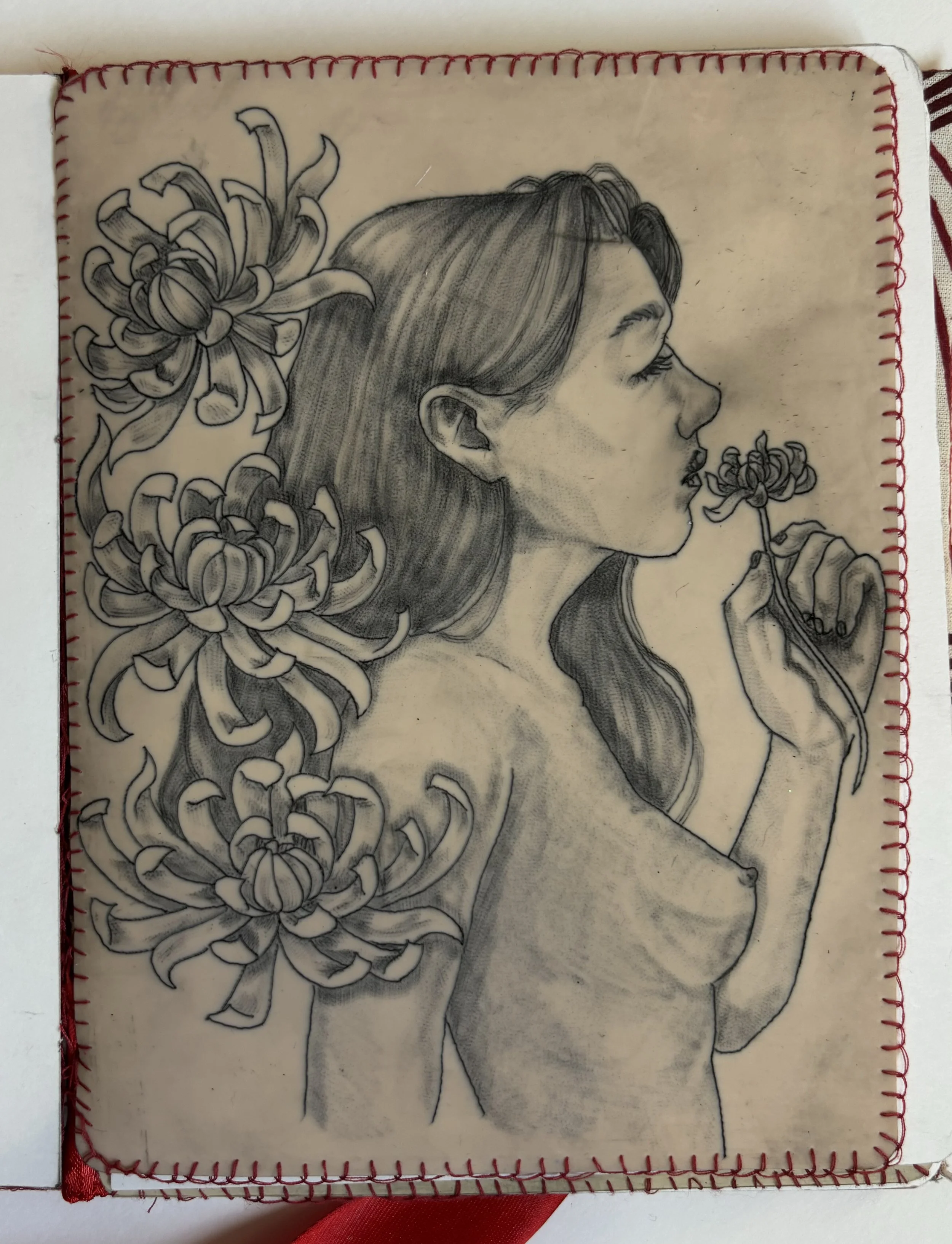 Handmade sketchbook with tattooed fake skin and embroidered cover, magnetic clasp; 2023; 7” x 5.5”