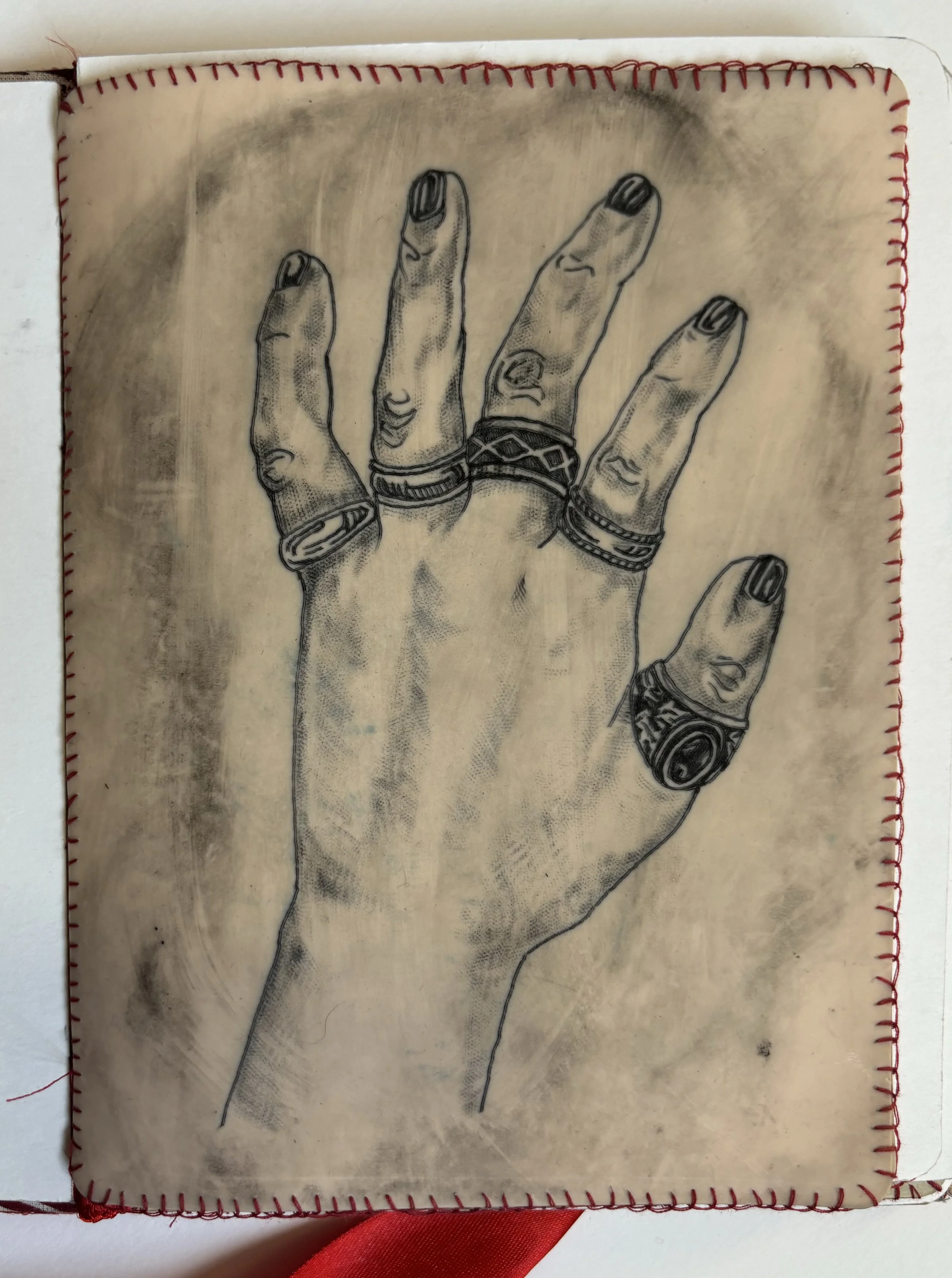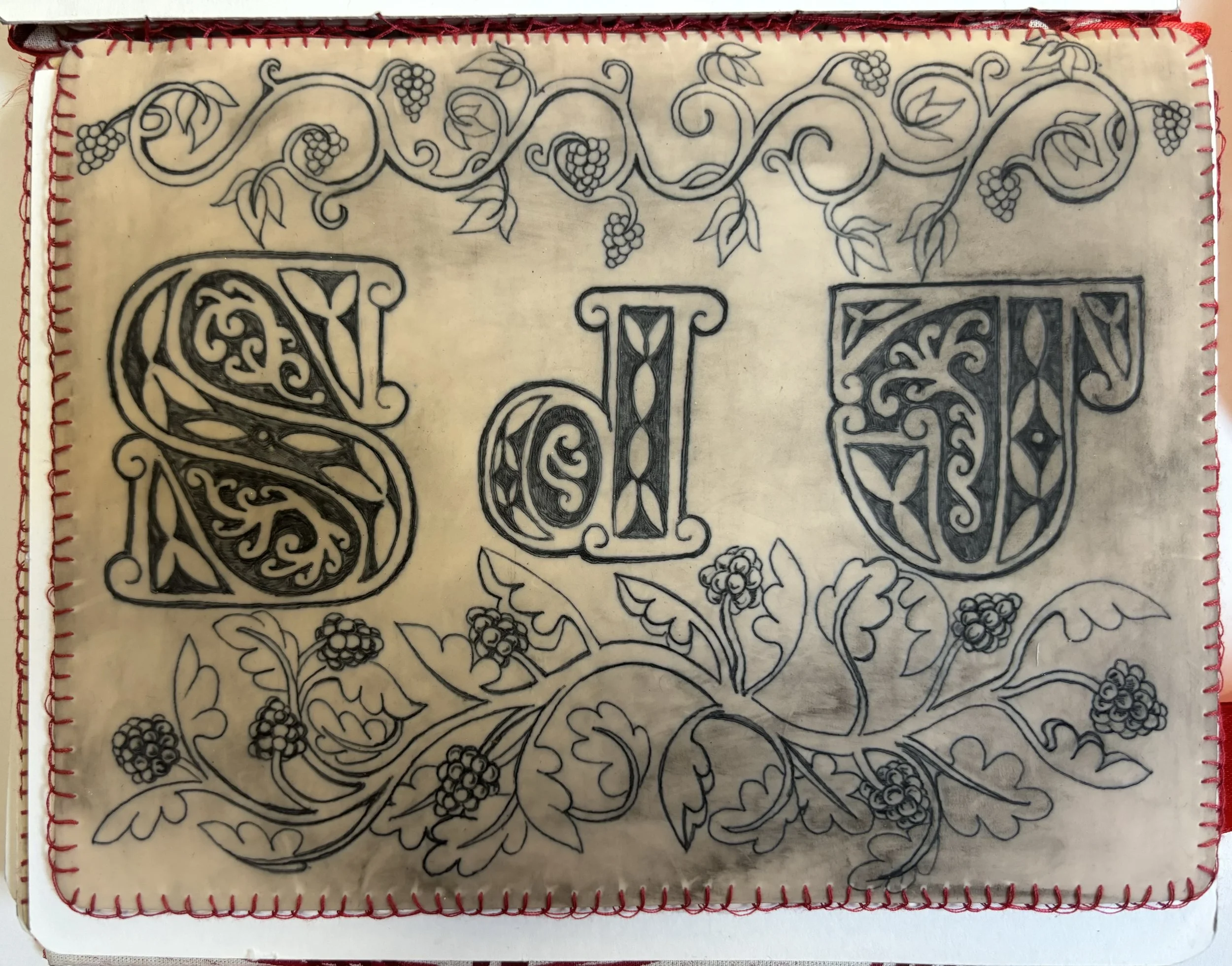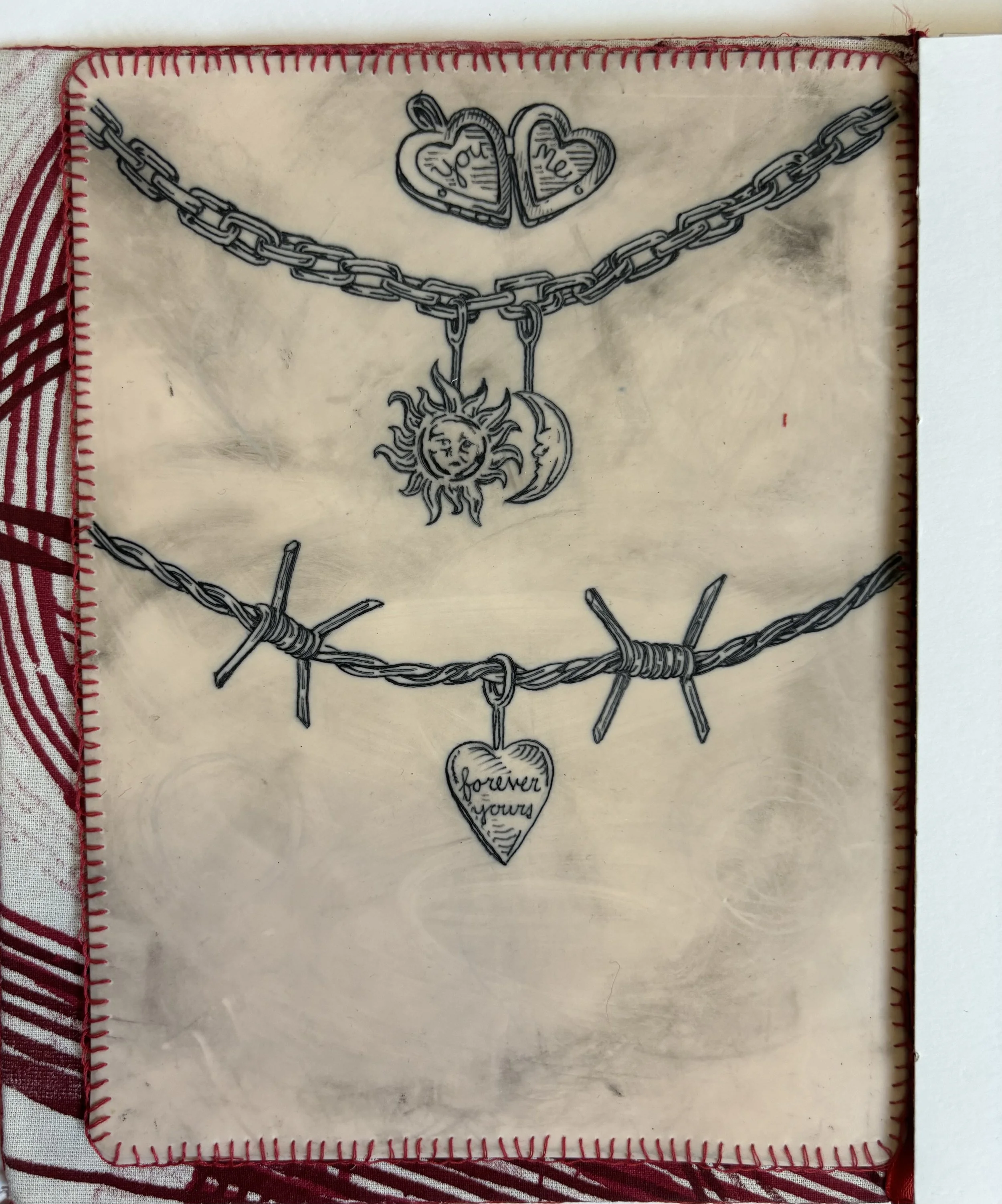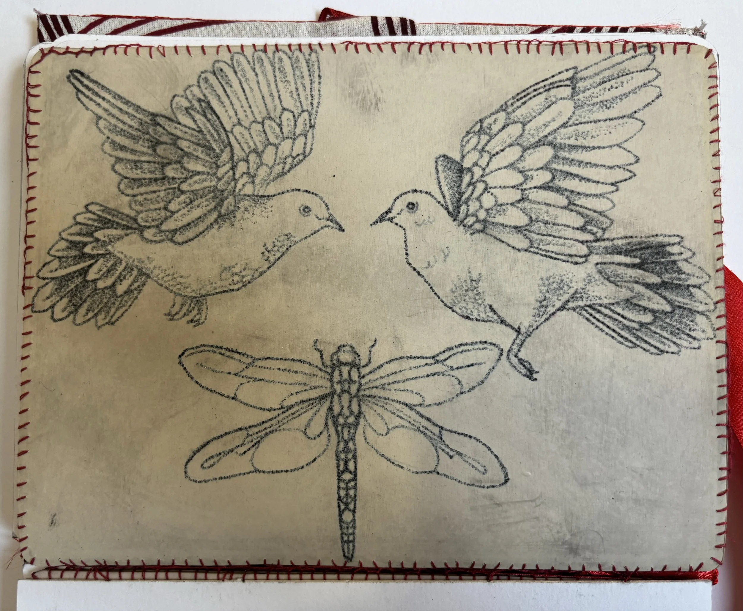 Handmade sketchbook with tattooed fake skin and embroidered cover, magnetic clasp; 2023; 7” x 5.5”