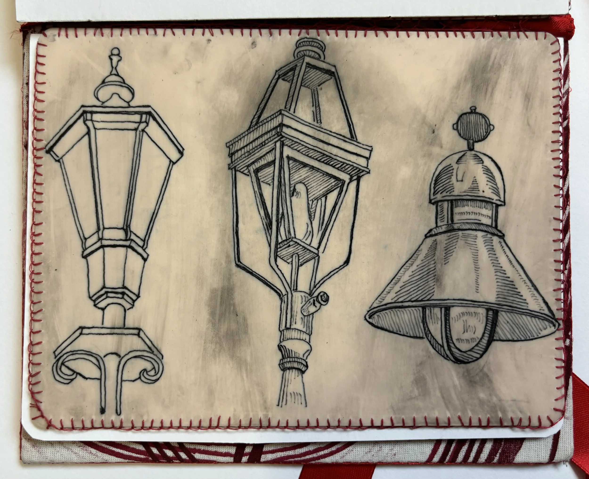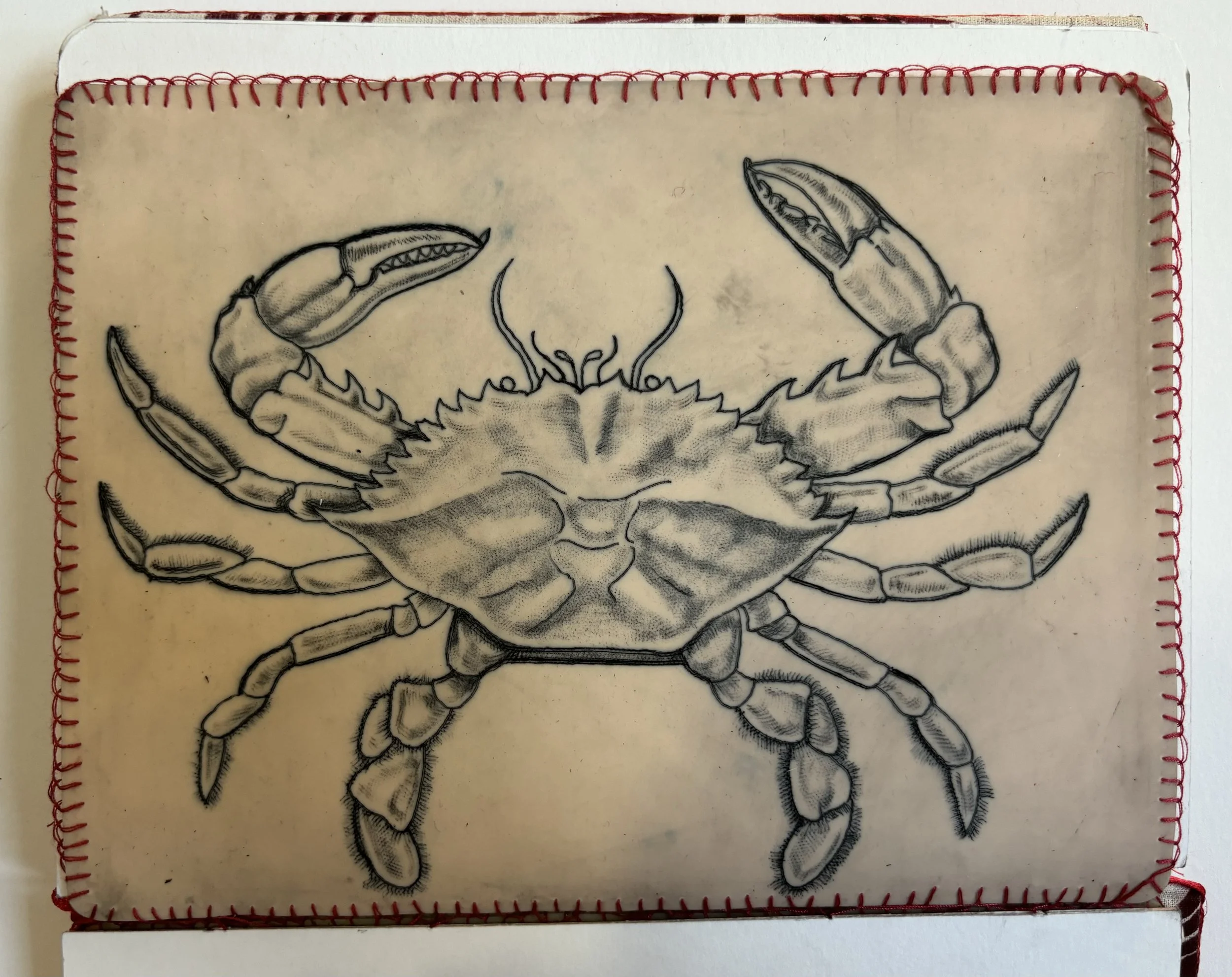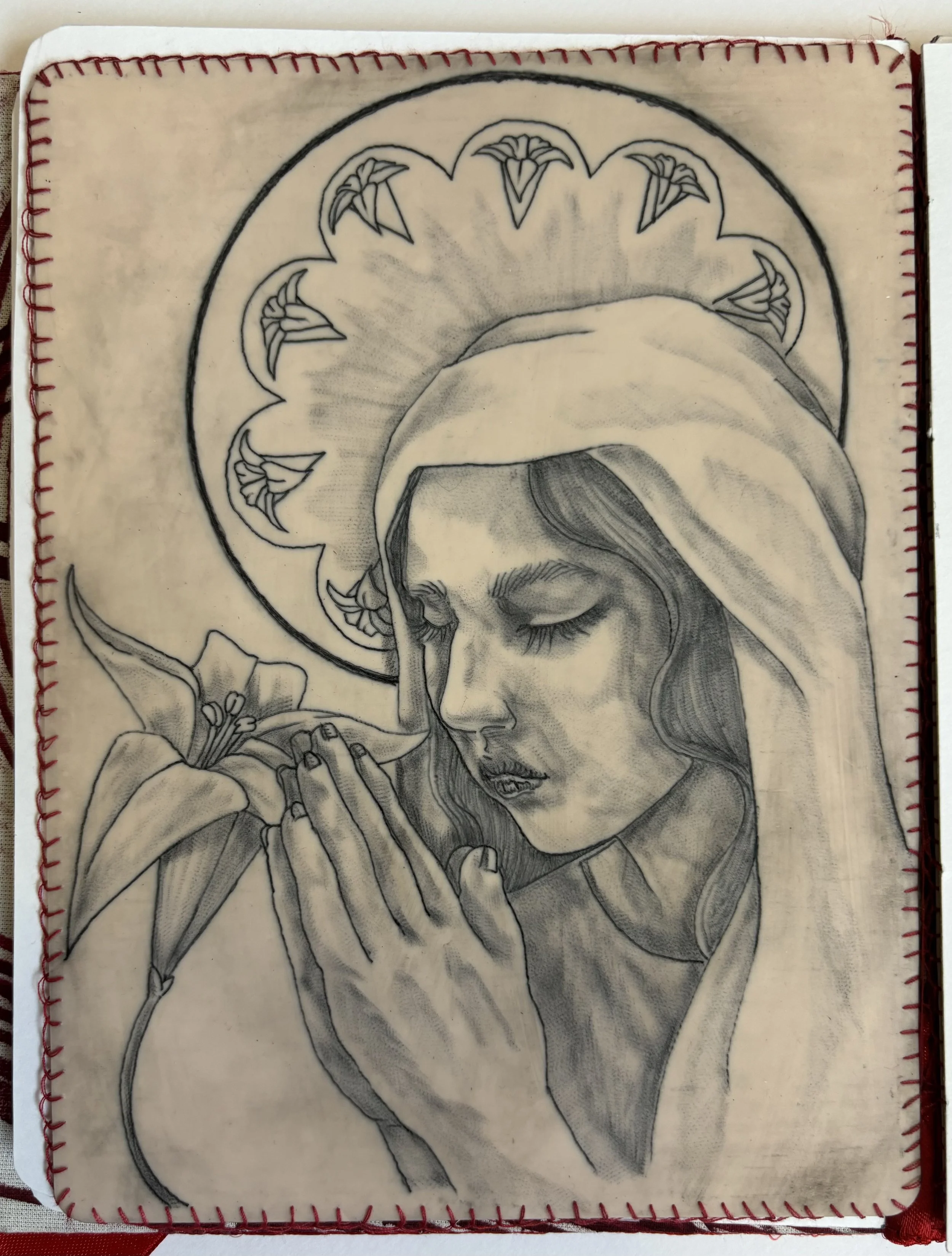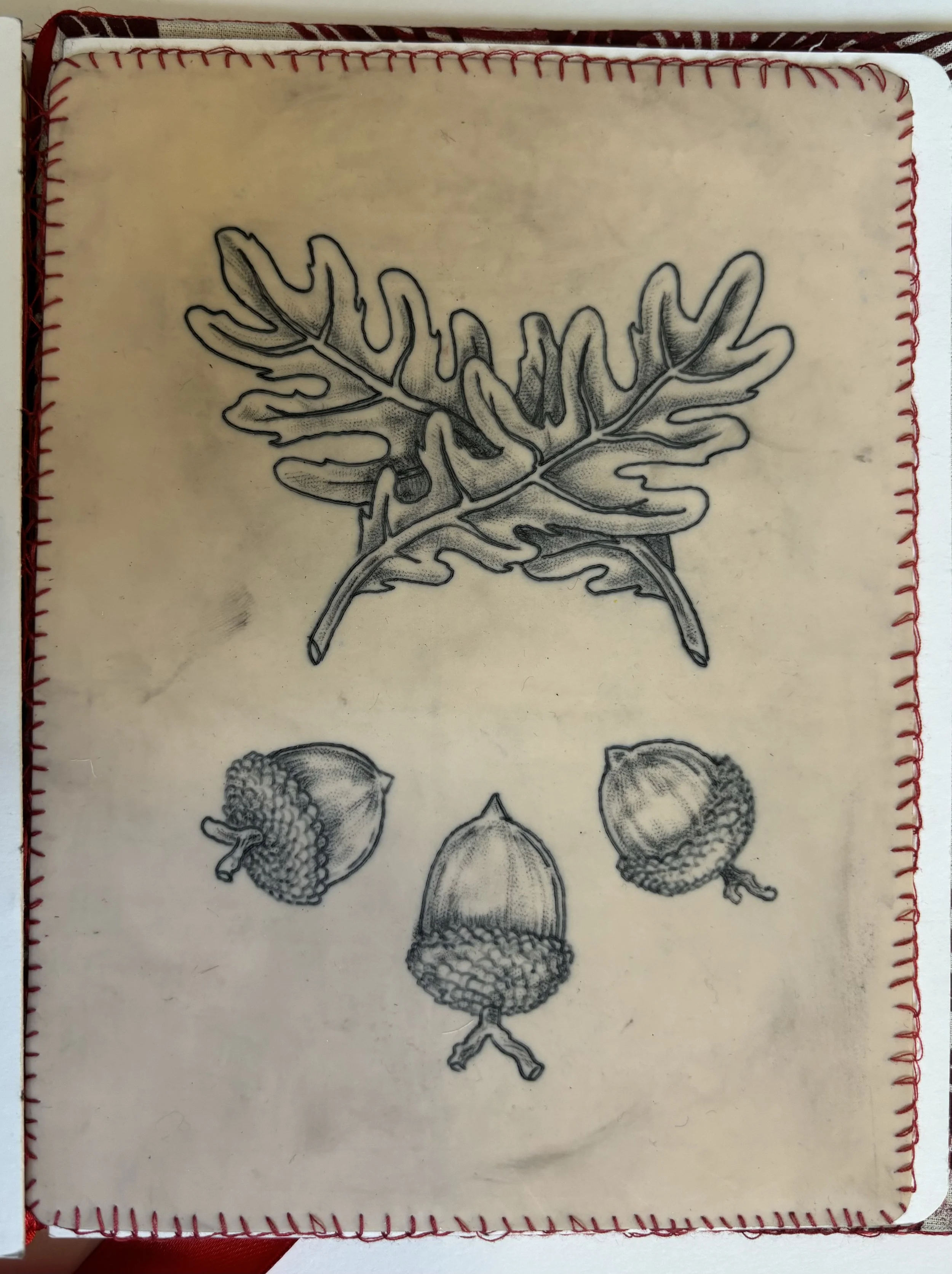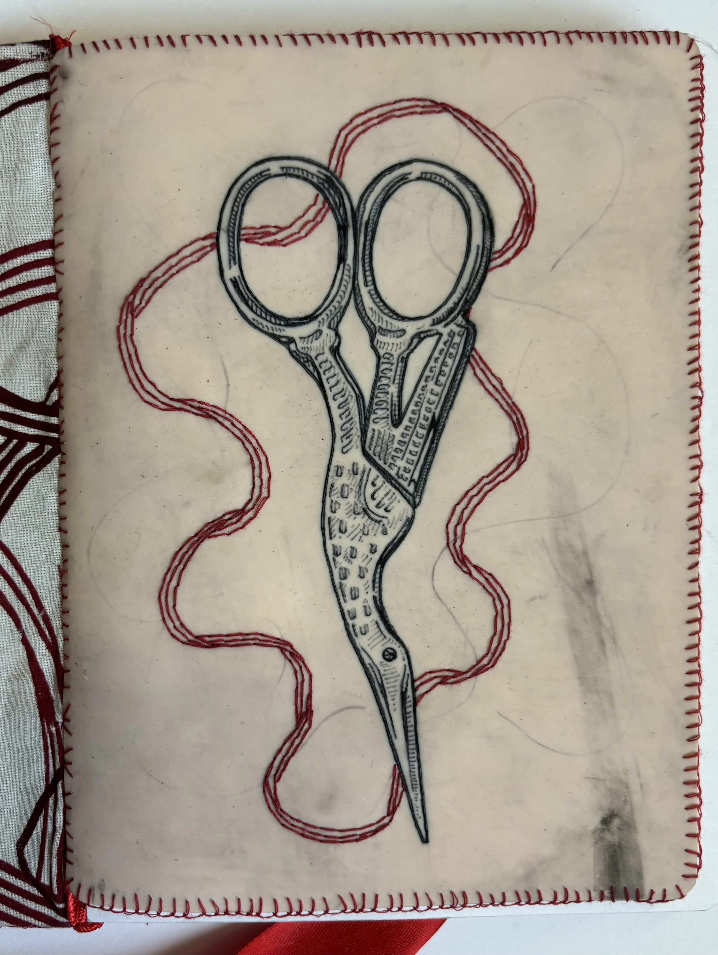 Handmade sketchbook with tattooed fake skin and embroidered cover, magnetic clasp; 2023; 7” x 5.5”