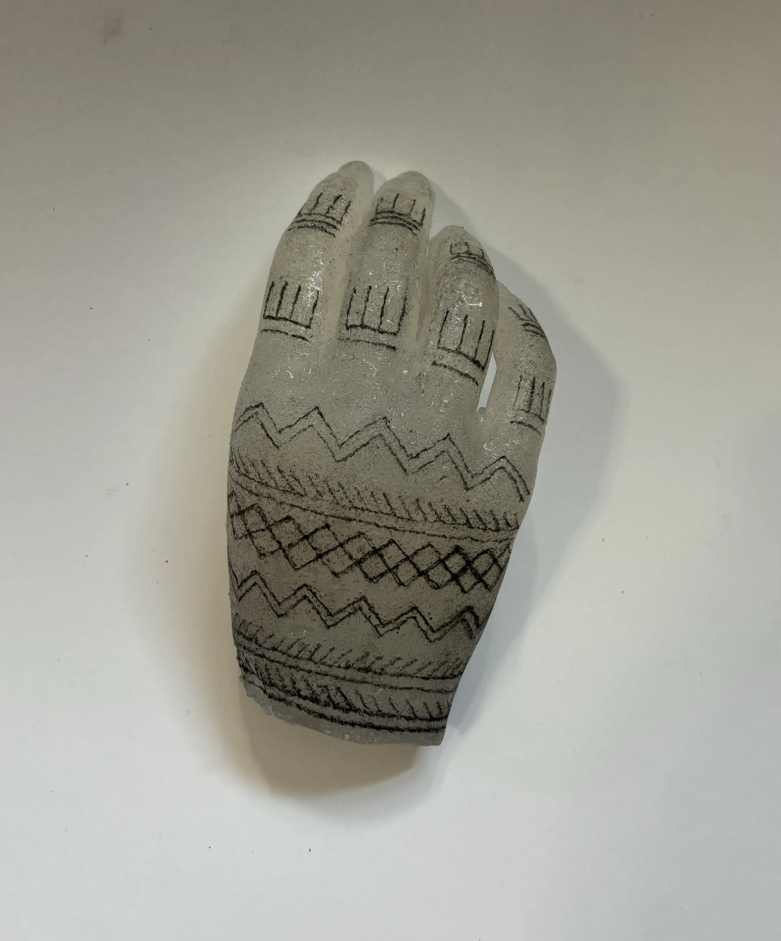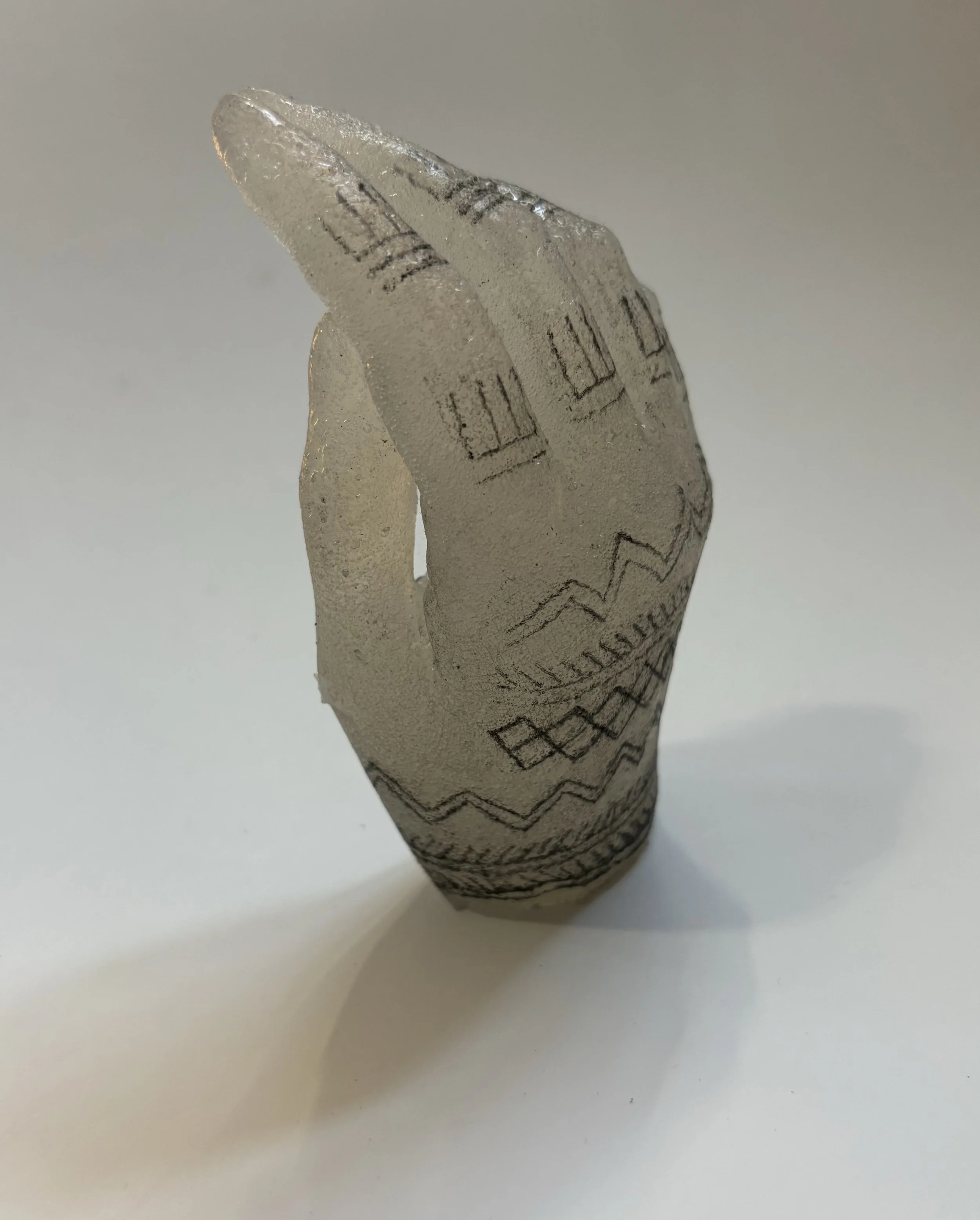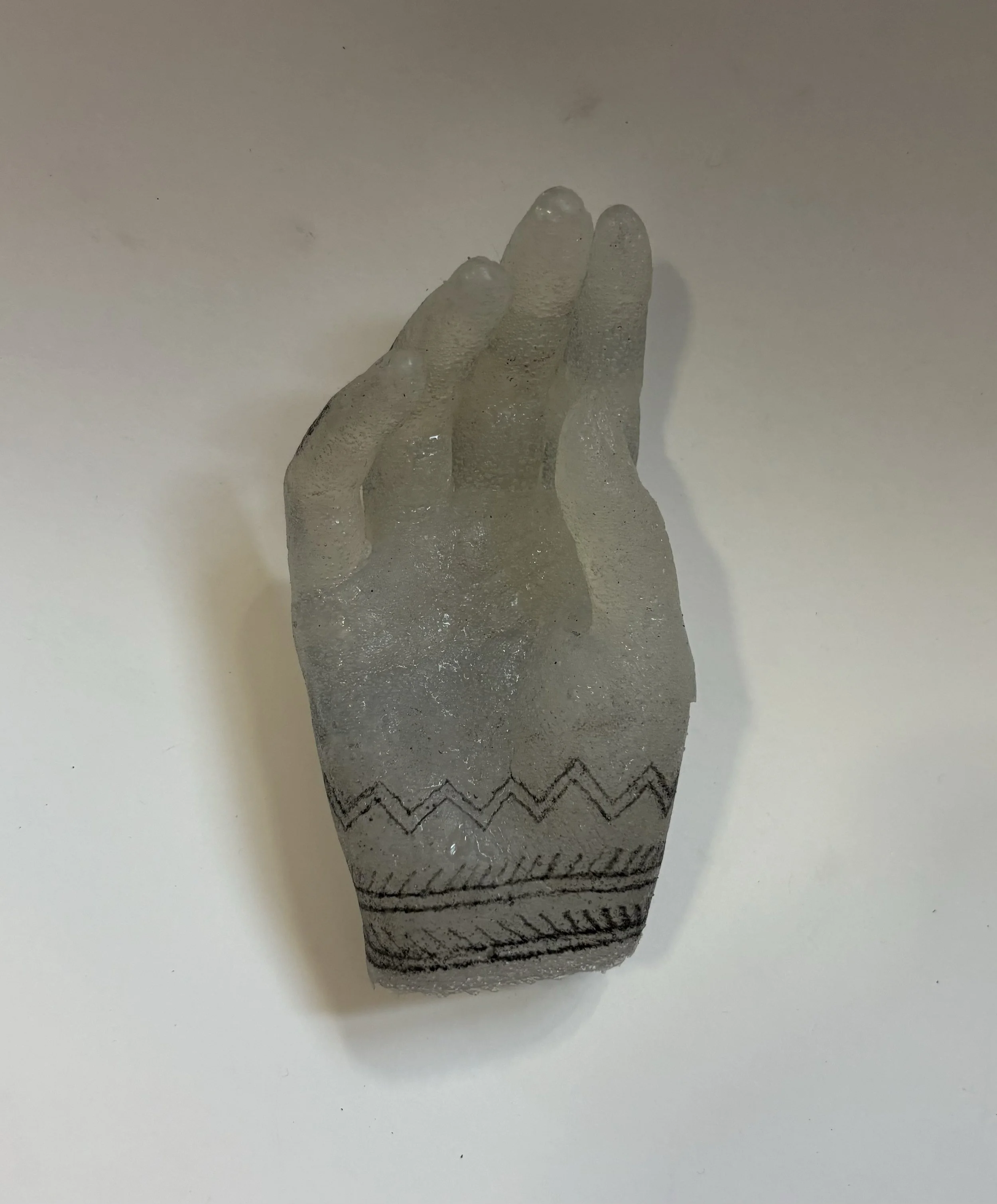 Artist’s hand cast in silicone and tattooed with traditional filipino motifs.