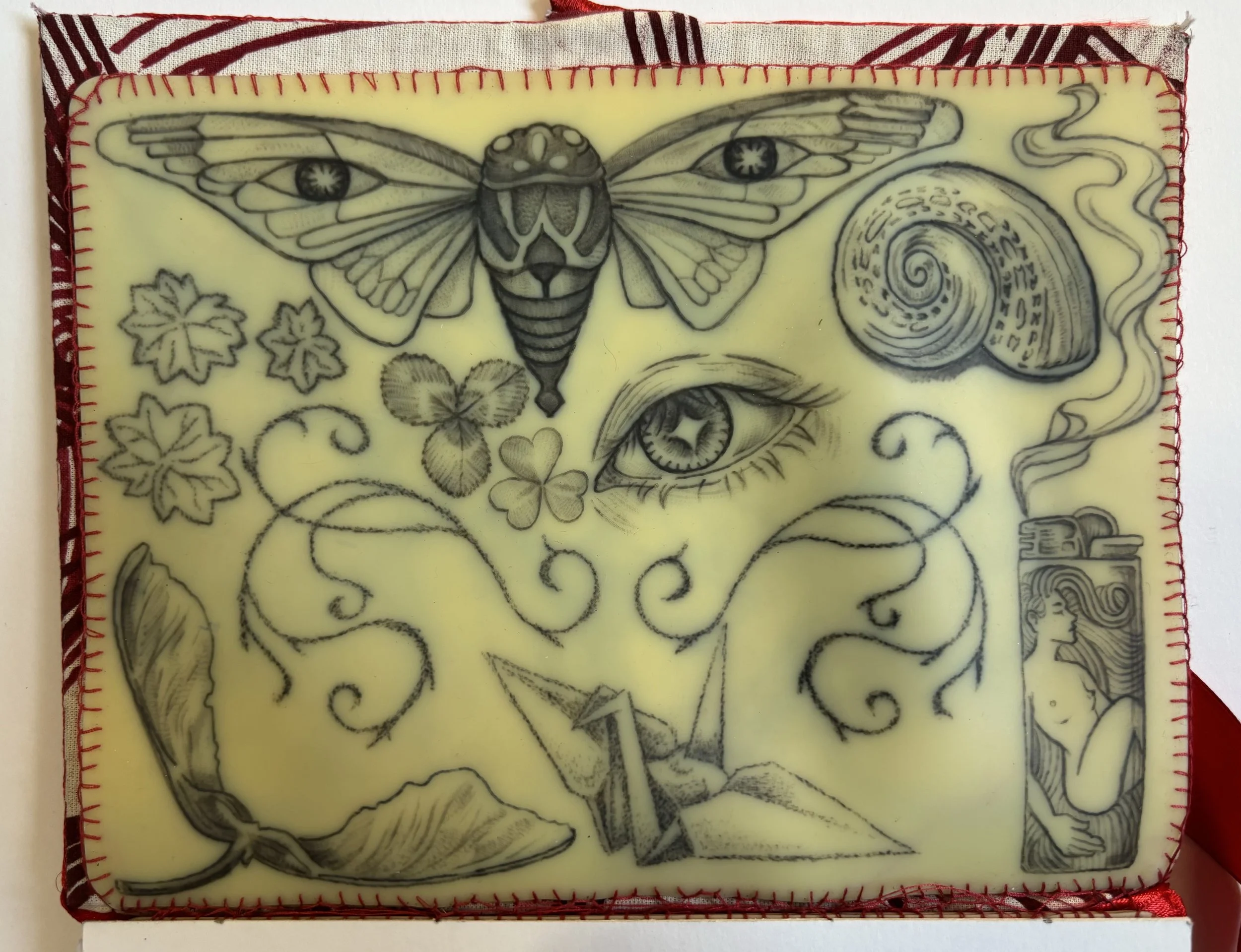 2023; 8” x 6.5” x 1.5”; tattooed fake skin, ribbon, thread, paper, ink, screen printed muslin