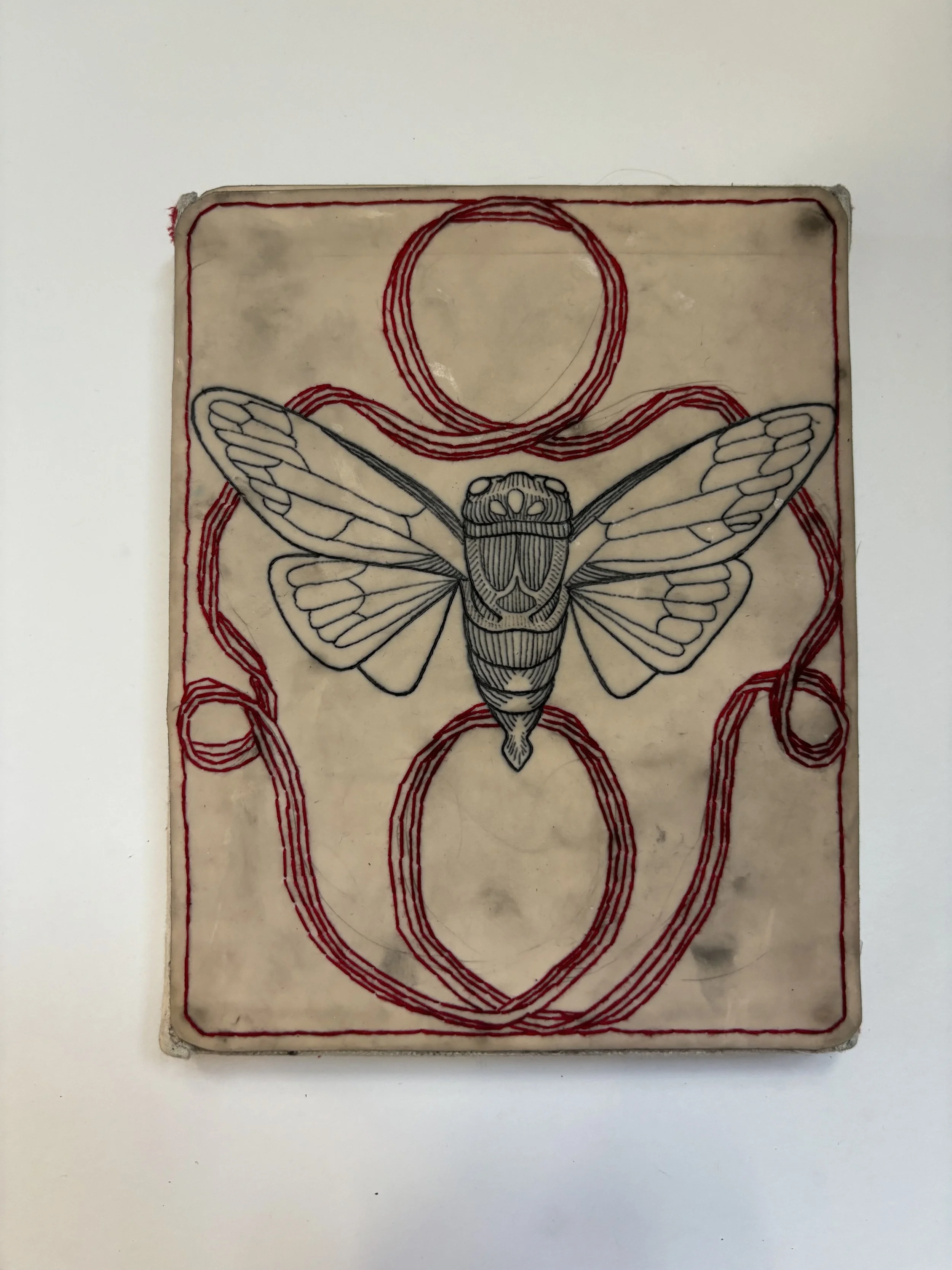 Tattooed leather; Roses: 2024; approximately 3.5” x 3” each; scrap leather tattooed and embroidered; Cicada: 2023; 12” x 12”; tattooed white leather