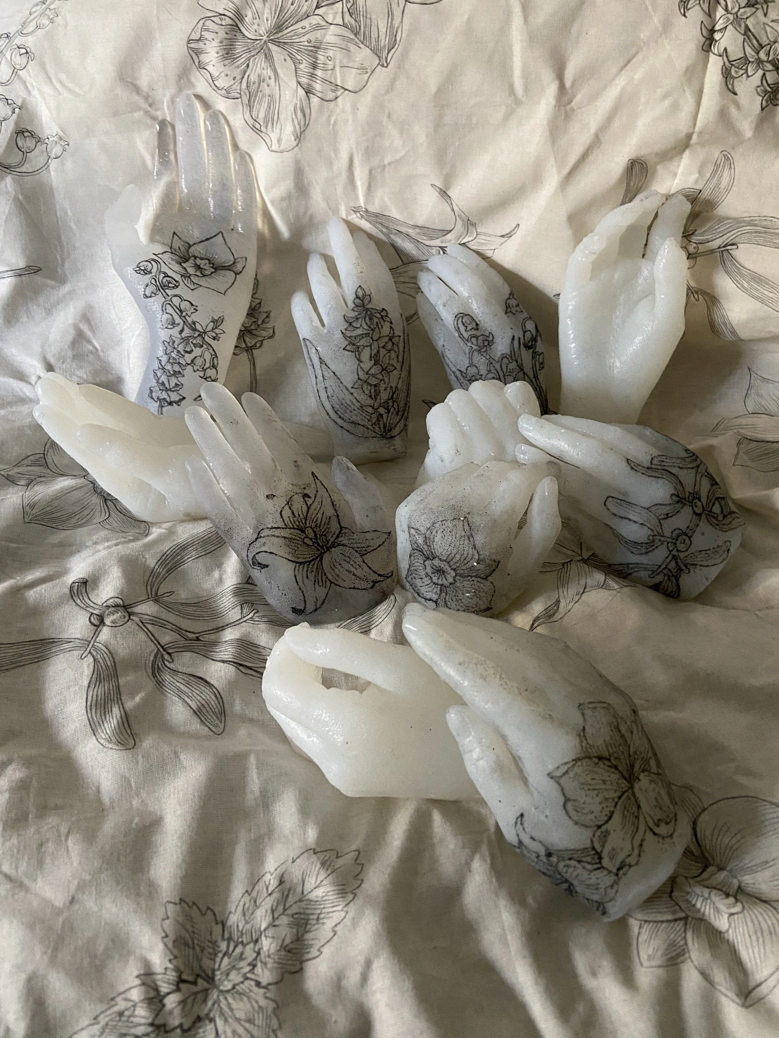 Artist’s hands casted in silicone and tattooed with images of poisonous flowers for Brutality Gardens installation.