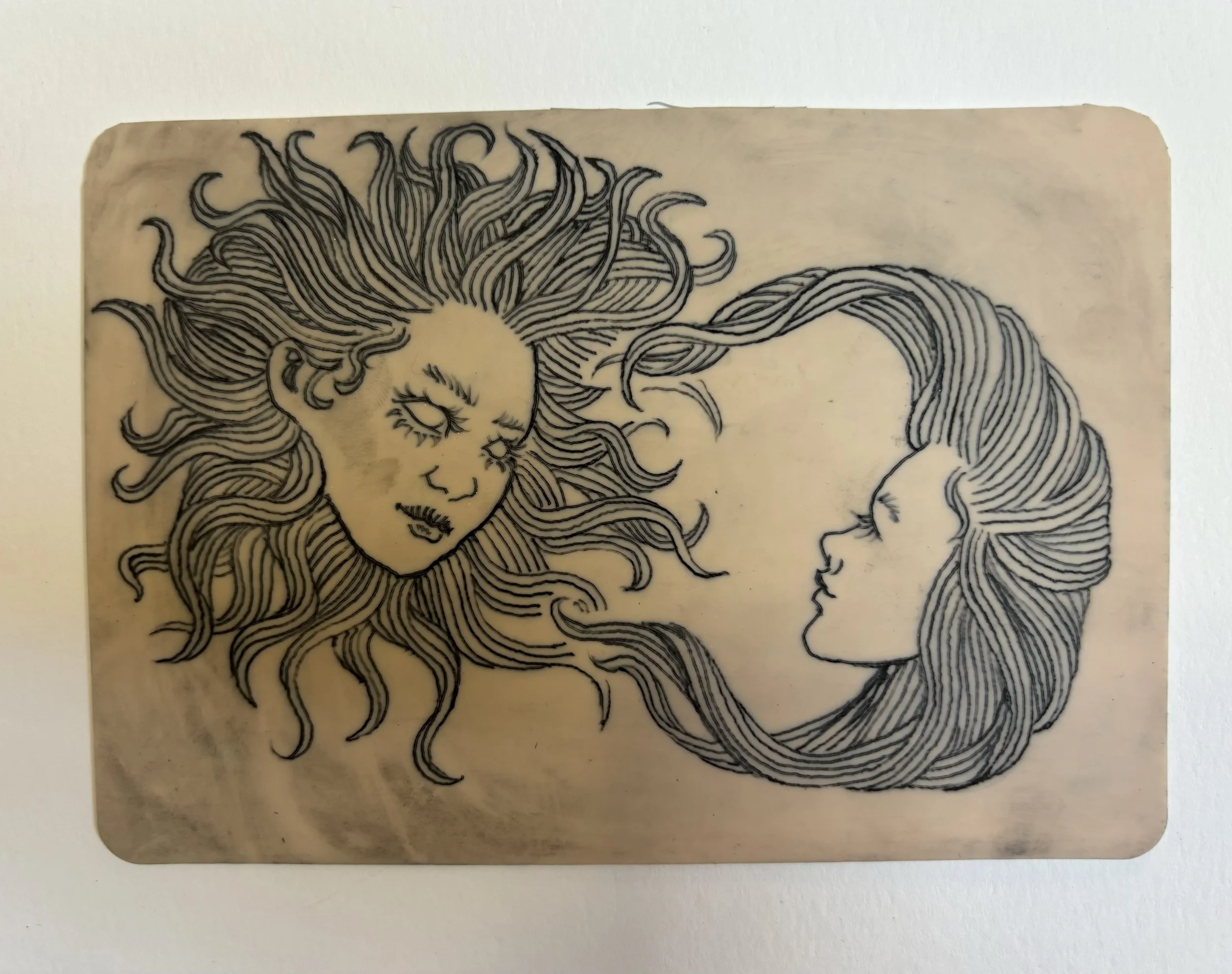 2023; 3.5” x 3.5”; tattooed fake skin, embroidery floss, paper, ink, gouache